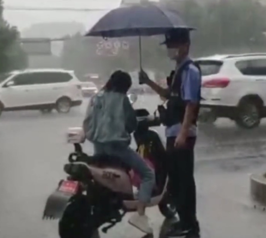 城市裡的暴雨突如其來,女孩孤零零地在馬路中央淋雨。