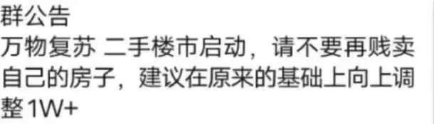該業主群截圖信息顯示,群公告裡寫著:“萬物復甦,二手樓市啟動,請不要賤賣自己的房子,建議在原來的基礎上,向上調整1萬+。”