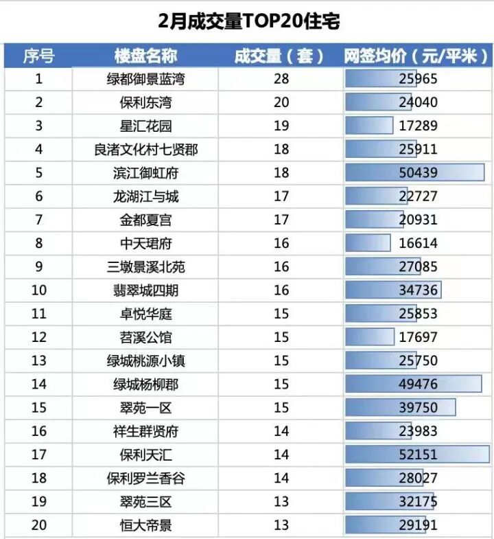 杭州《2月成交量TOP20住宅》中,蕭山區義橋板塊的綠都御景藍灣以28套的成交量位列榜首,成交均價2.6萬/方;排名第二的是錢塘區下沙沿江板塊的保利東灣,上個月成交20套,均價2.4萬/方;臨安區青山湖科技城板塊的星匯花園成交19套,排名第三,成交均價1.7萬/方。