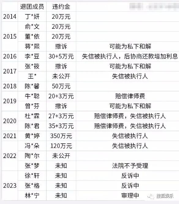 有博主整理了2014-2023年SNH48退團成員名單及應付違約金,包括黃婷婷、馮薪朵、張語格等人,其中違約金最低20萬,最高350萬,目前有6人成為了失信被執行人。