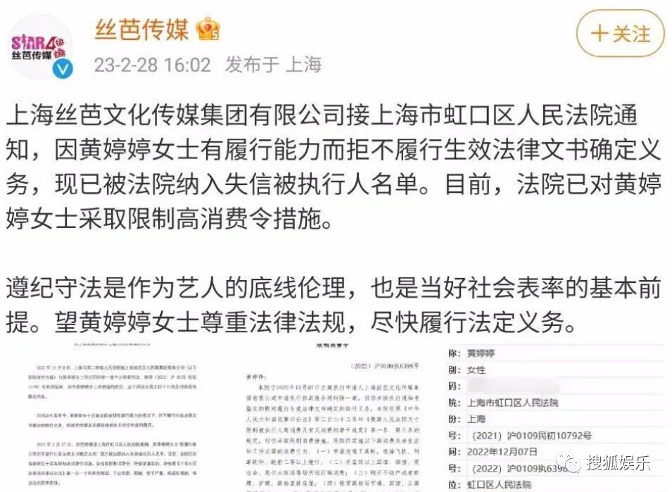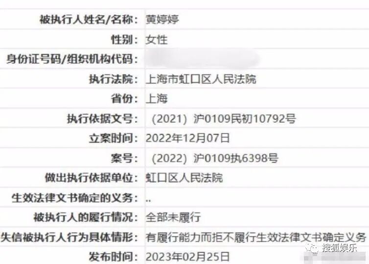 原來,由於黃婷婷一直沒有支付350萬的違約金,她被法院納入了失信被執行人名單,被採取限高措施。