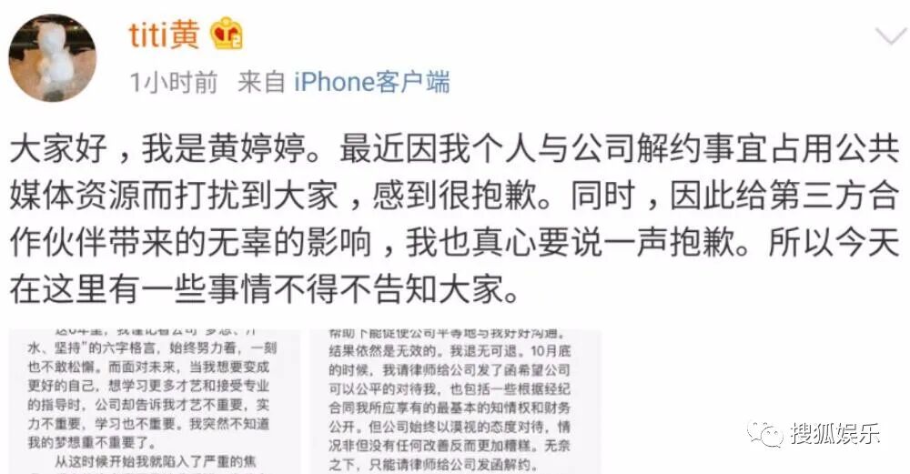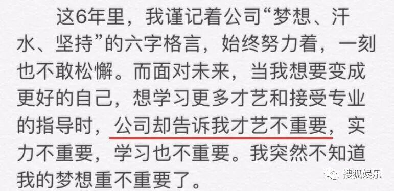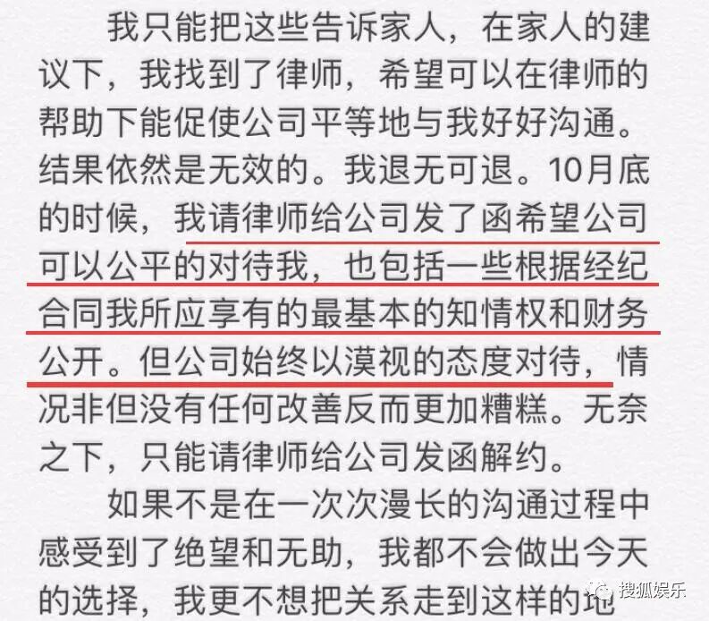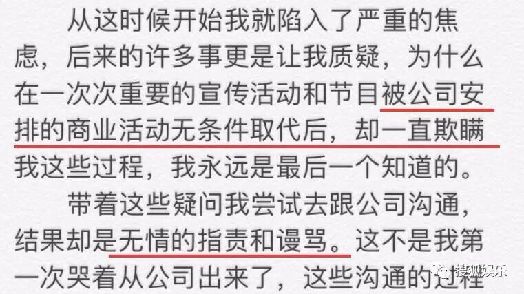 她在文中稱,很多次重要的宣傳活動和節目都被公司安排的商業活動無條件取代,“我帶著疑問和公司溝通,結果卻是無情的指責和謾罵。這不是我第一次哭著從公司出來了……一再的妥協和隱忍等來的卻是更多的隱瞞和欺騙。”