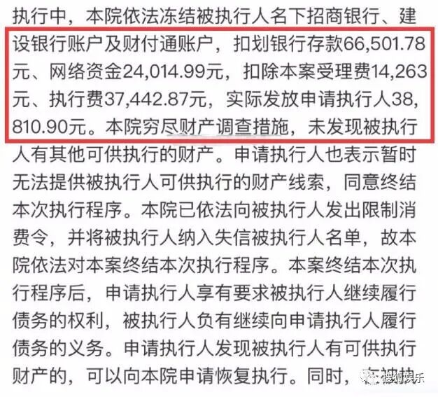 隨後,絲芭文化向法院申請強制執行,法院依法凍結黃婷婷名下賬戶,僅查出9萬財產。其中,扣劃銀行存款6.6萬餘元、網絡資金2.4萬餘元。