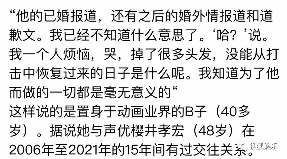 讓人難以置信的是,A子並不是渣男隱瞞婚姻情況交往的唯一情人,還有一位交往15年以上的動畫從業者B子。她稱與櫻井孝宏自2006年起就開始交往了,直到2021年才結束戀愛關係。