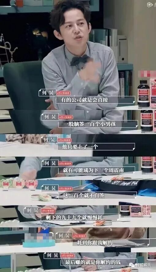 何炅曾在一檔節目中爆料過,有的公司就是會一次性簽約100個小孩,只要其中一個人火了,這100個就不白籤,剩下的99個就慢慢耗,“耗到你跟我解約,最後賺的就是你解約的錢”。