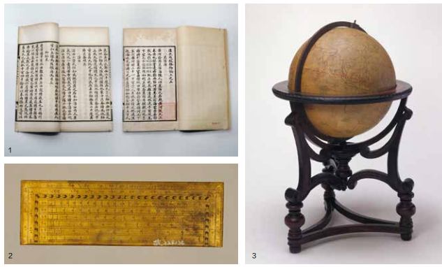 1 《幾暇格物編》(石印本),清,現藏故宮博物院。此書是康熙皇帝在政事餘暇,學習、研究、考察自然科學、文化現象的短篇文集,涉及天文、地理、生物、農業科學實驗等內容,每篇都包含康熙皇帝的個人見解;2 銅鍍金綜合算尺,清康熙,現藏故宮博物院;3 地球儀,清康熙,現藏故宮博物院。康熙帝熱衷西學,令傳教士每日輪班進宮,系統地為其講授西方科學知識
