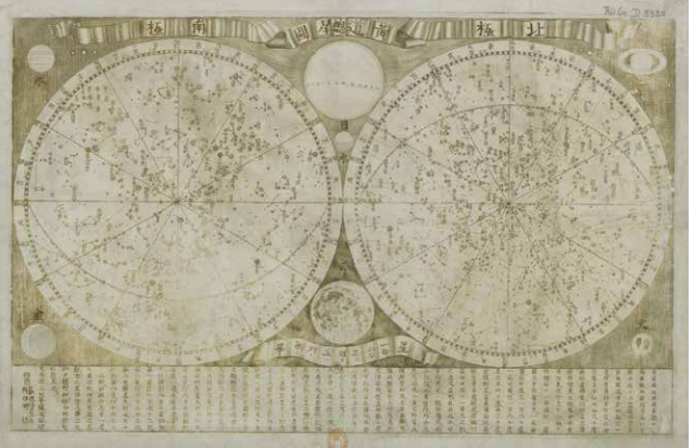 《黃道總星圖》,清雍正,戴進賢(IgnatiusKgler),現藏法國國家圖書館。此圖以黃極為中心,以外圈大圓為黃道的二幅南北恆星圖,以直線分為十二宮,邊列宮名,節氣隨之,星分六等