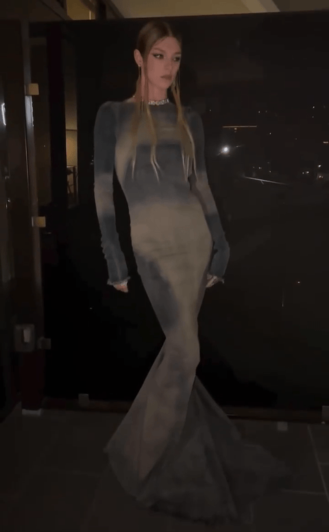 這身Rick Owens牛仔禮服造型也是一絕,搭配上這妝容和髮型,真的不是《指環王》裡的精靈嗎!▼