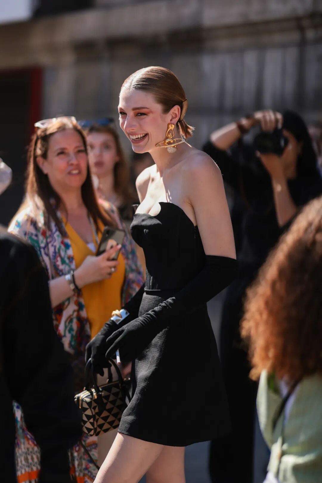 時裝週期間這身Schiaparelli小黑裙簡直美翻了,緊身胸衣和牛角領口設計,配以質感十足的黑絲絨長手套,復古摩登,一對大號耳環更是為整體造型與氣質增色不少▼