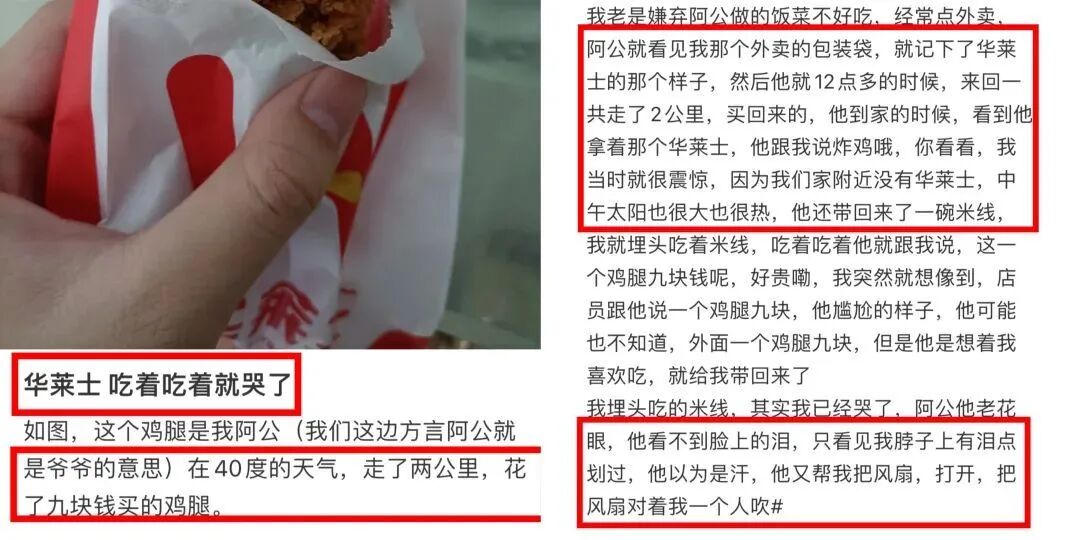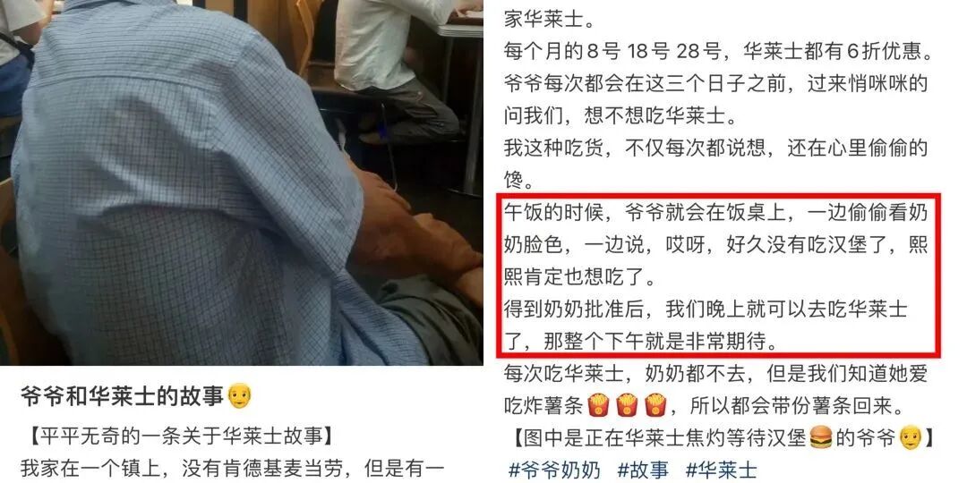 還有網友寫了爺爺和華萊士的故事,她說在每個月打折的那幾天,爺爺都會在飯桌上做輿論動員,像對暗號一般等待著奶奶的批准,然後開心地帶娃兒去吃華萊士。