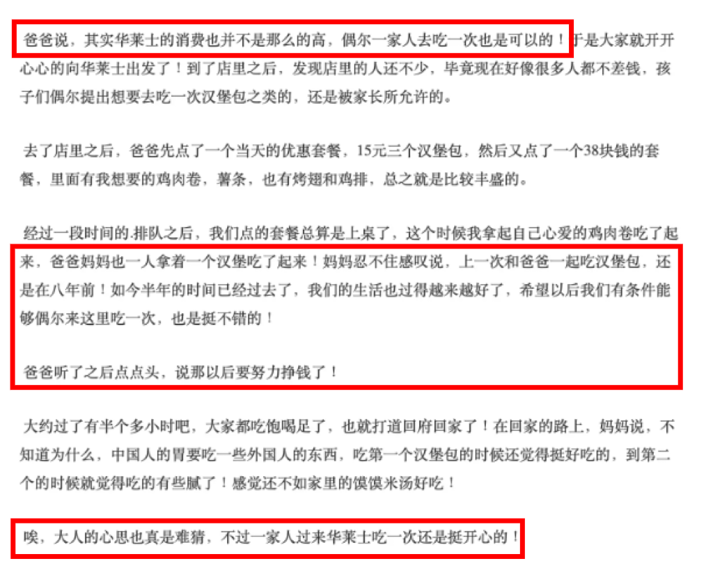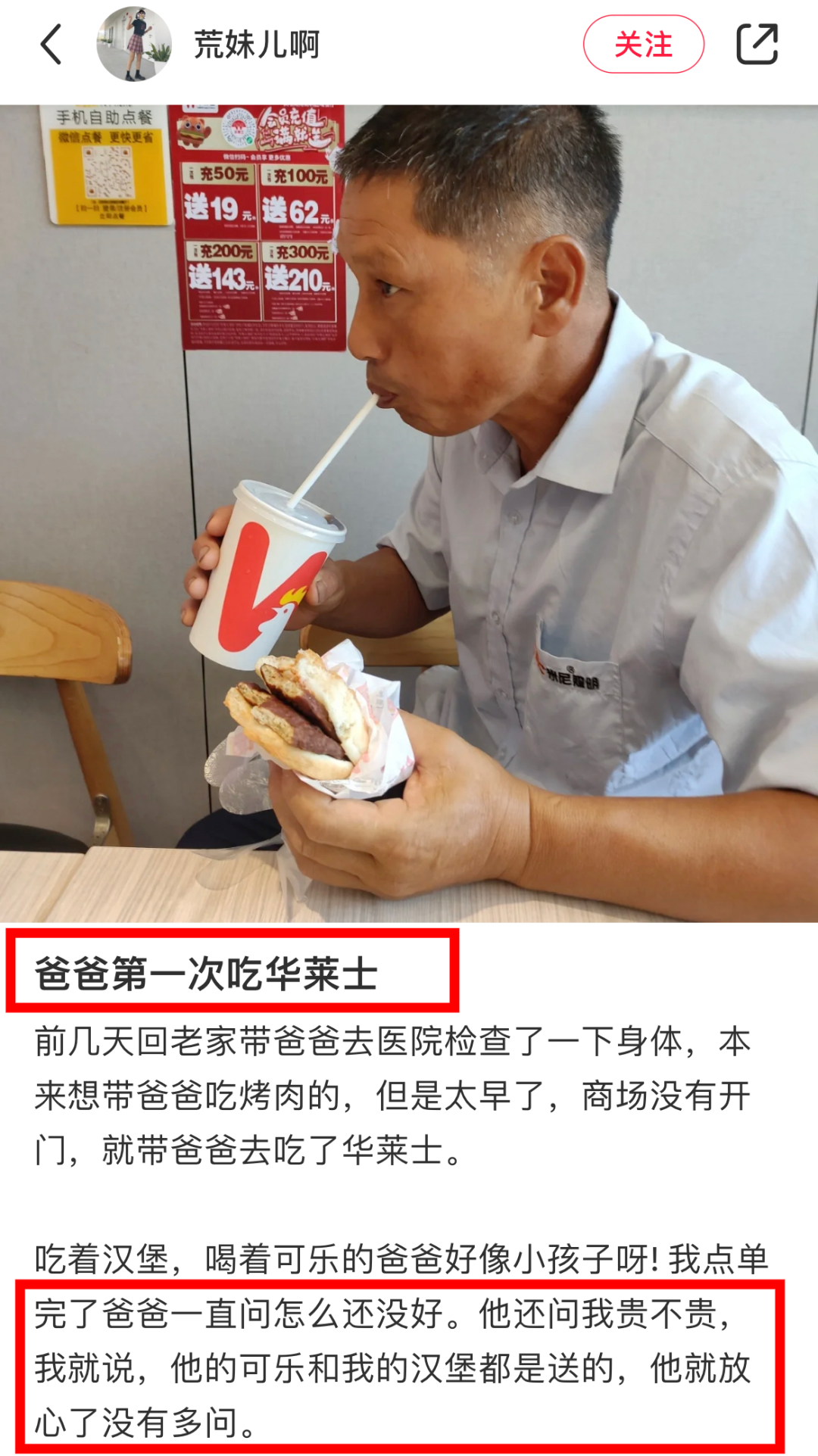 有人記錄帶爸爸去檢查身體時,他第一次吃到華萊士,爸爸會先問這個貴不貴,聽到可樂和漢堡都是送的,才放心地一手一個拿了起來。