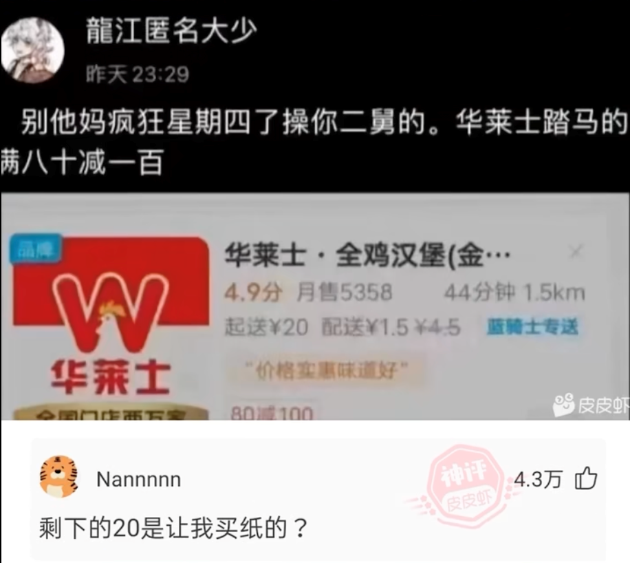 有人在瘋狂星期四文案下調侃,華萊士100-80的差價是不是用來買紙?