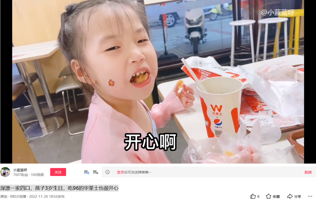 那天我刷到了深漂的一家四口,在孩子3歲生日那天他們去吃了96元的華萊士套餐。