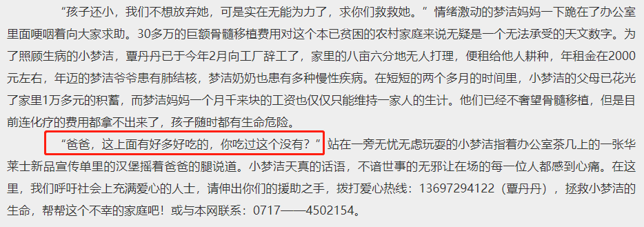 十幾年前,即將面臨殘酷疾病折磨和鉅額醫療花費的小夢潔,尚無憂無慮的她指著華萊士新品傳單上的漢堡問:“爸爸,這上面有好多好吃的,你吃過這個沒有?”
