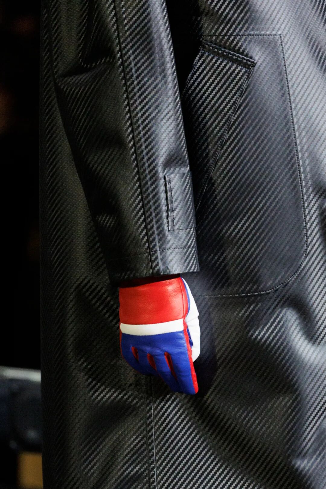 反覆出現的“法國”手套,與長款黑色風衣配搭,有種激情賽車手的搖滾颯氣。