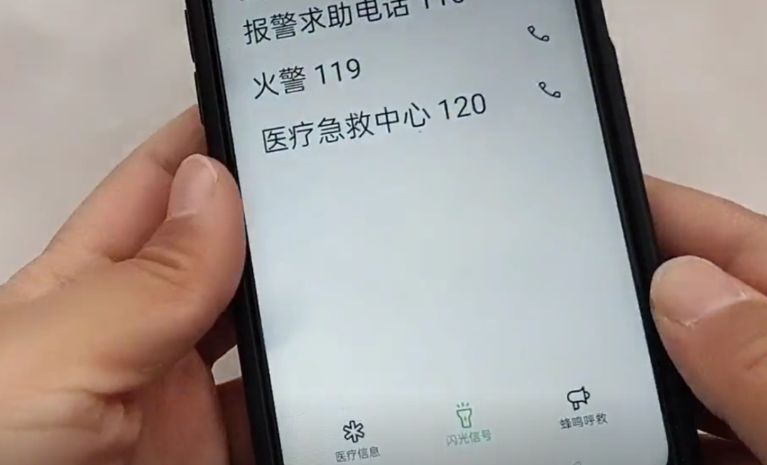 第三個妙用,當我們的手機在鎖屏的狀態下,連按電源鍵五下,就可以直接打開這個界面,我們也可以直接撥打電話,在下面有一個閃光信號,我們可以看一下,在手機有電的情況下,就可以使用這個閃光信號,然後還有一個蜂嗚求救。
