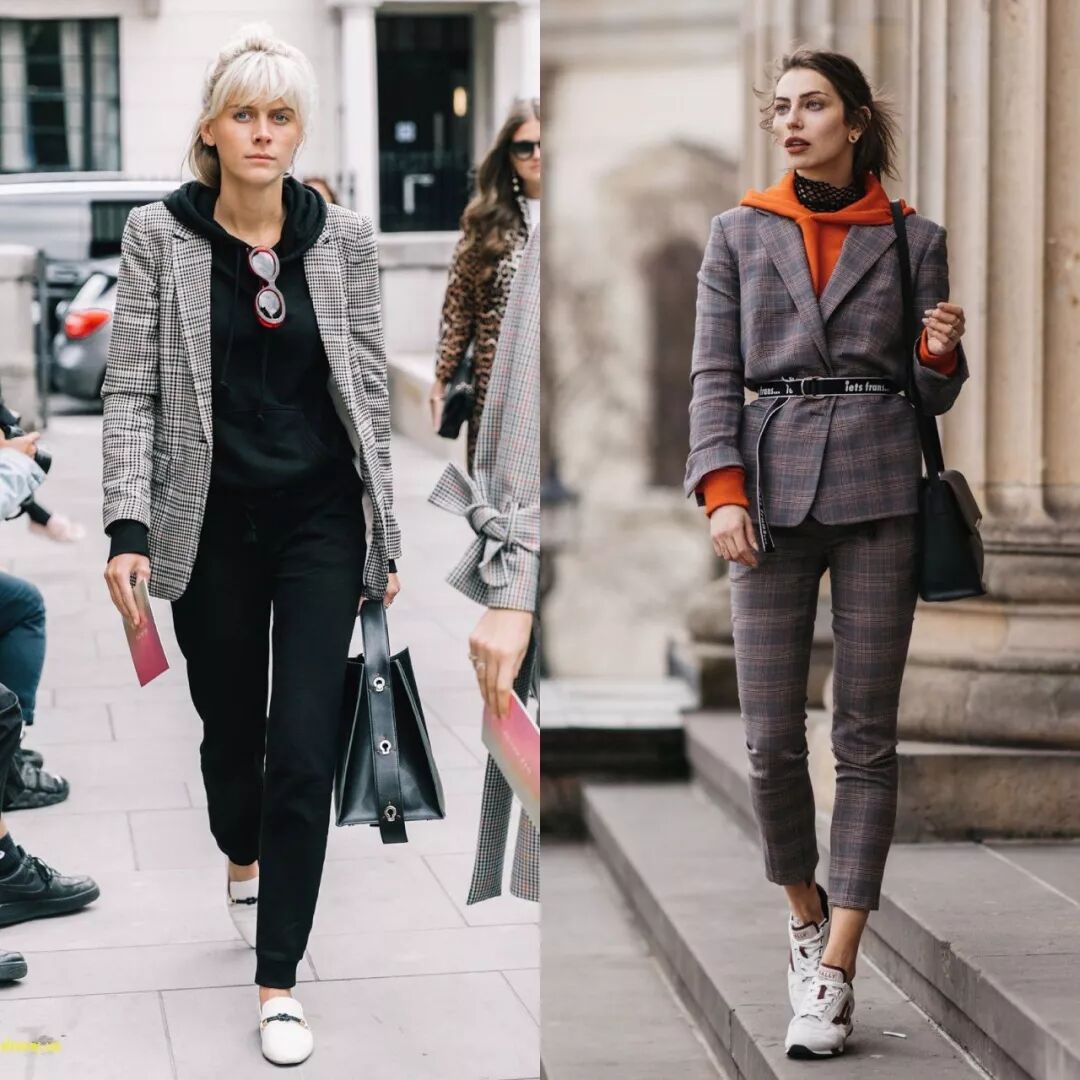 “衛衣+西裝”的穿法,看似簡單卻很時髦,衛衣的休閒與減齡,正好可以減少西裝帶來的嚴肅和正式感,讓整體穿搭多一些休閒氣息。