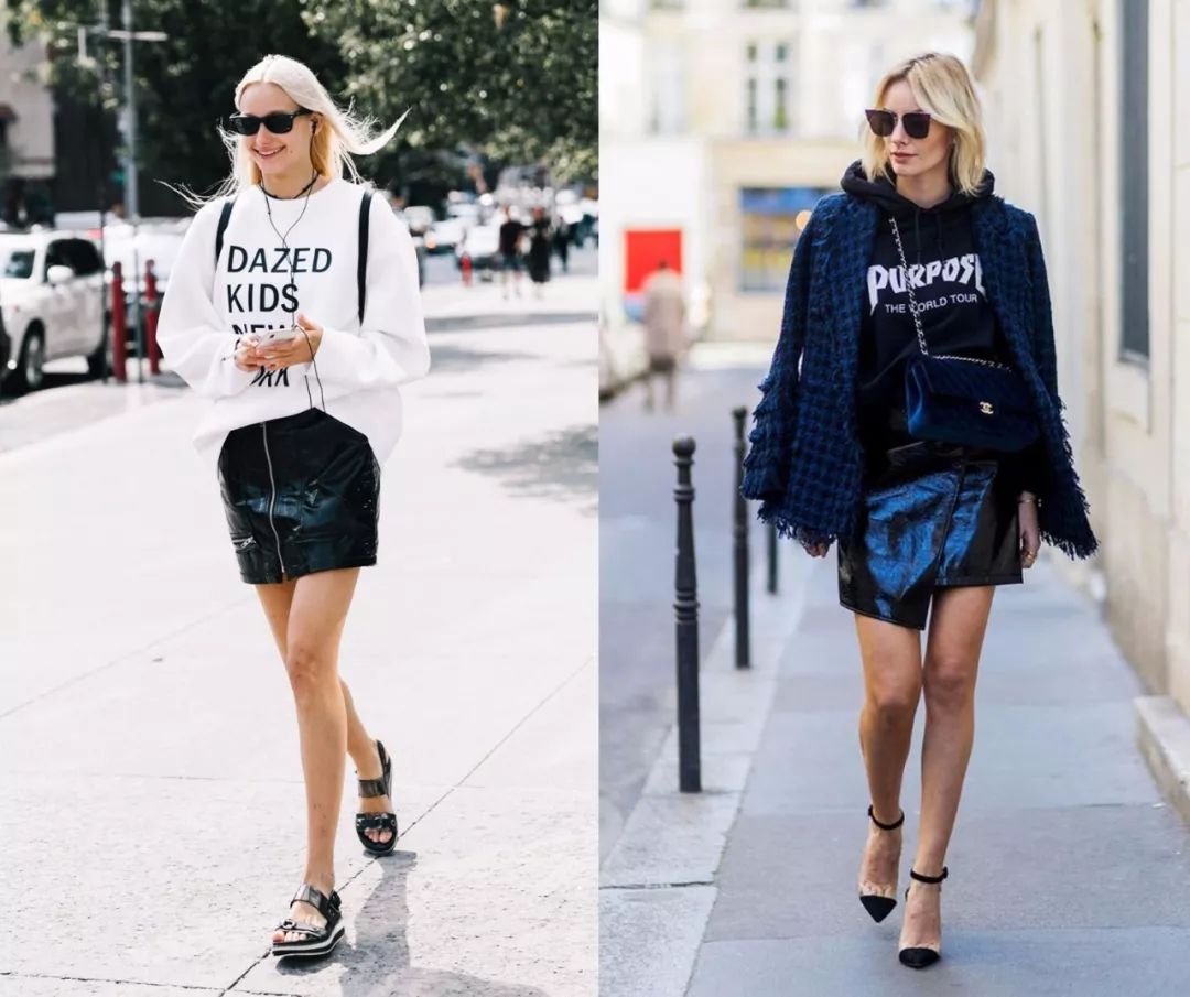 衛衣最搭的裙子,絕對非皮裙莫屬。兩個又酷又個性的單品,結合起來超級養眼!