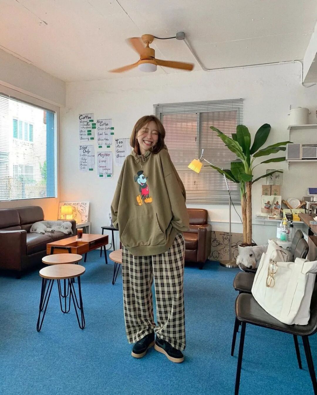 清淺的奶油色調衛衣套裝,元氣可愛,堪稱學生黨首選。