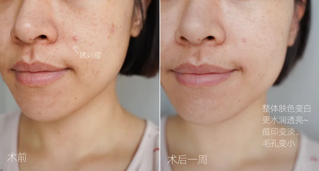 先給你們上圖!還是很給力的!我做一次的效果,斑點已經淡了50%以上(醫生跟我說3次才能乾淨)。除了斑點,膚色和毛孔都有改善~術後有一週結痂恢復期,不能化妝塗防曬,需要帽子口罩出門。