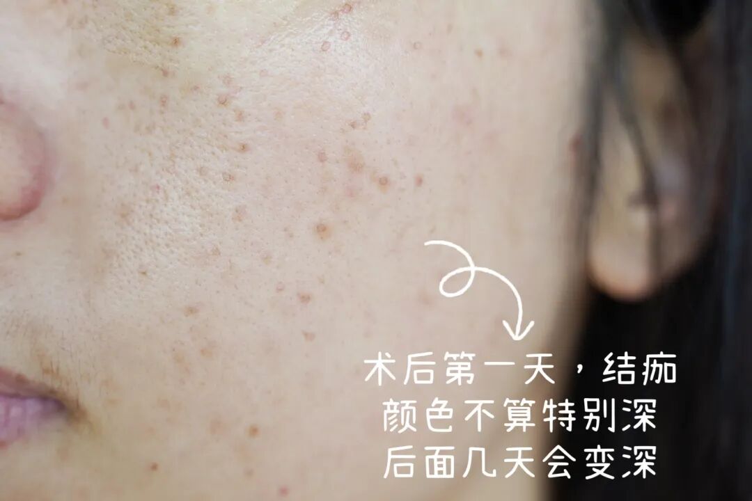 術後臉上會結一層痂,不要去摳,恢復期在7-10天,等它自然脫落即可。術後兩三天臉最好不要碰生水,網上買生理鹽水擦一下就好了,可以每天敷敷醫美面膜,更有利於恢復~