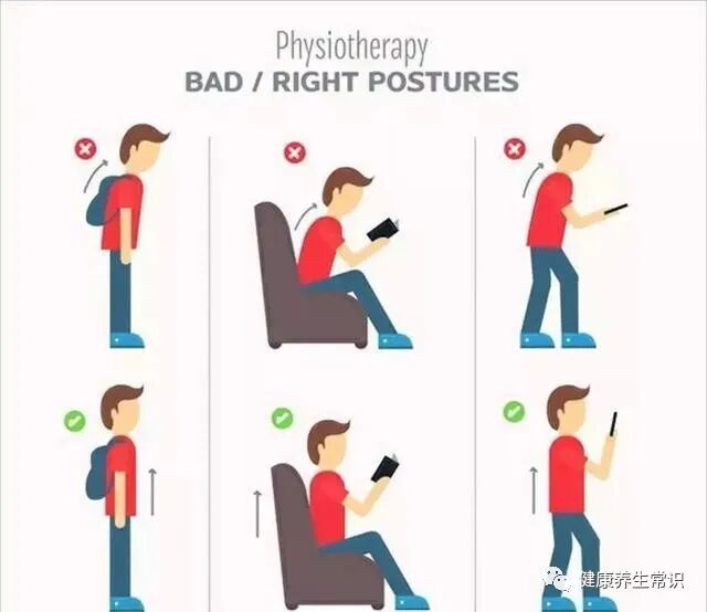 日常的行住坐臥,先要糾正起來,給頸椎減負,不然再好使的招數也救不了你的頸椎。下面這張圖都是小孩子都知道的體態示範,平時多注意注意,提醒一下自己。