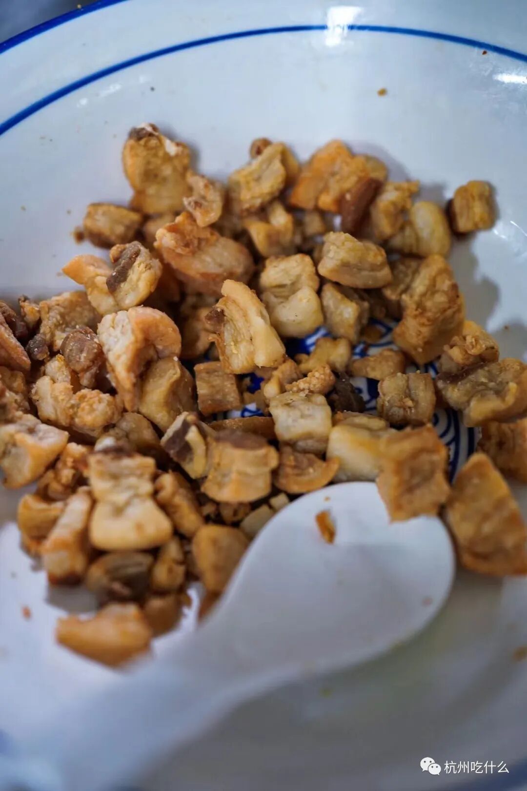 傳菜口擺著一碗豬油渣,喜歡的可以往面里加一勺,免費的。過去這種手法是常見的,如今,興許是出於成本考慮,又或者嫌麻煩?多數麵館都取消了免費加豬油渣的優良傳統。