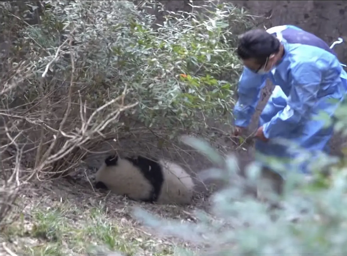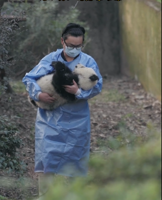 飼養員抱起大熊貓,用手清理掉它身上的雜草灰塵,抱在懷裡撫摸安慰了半天……