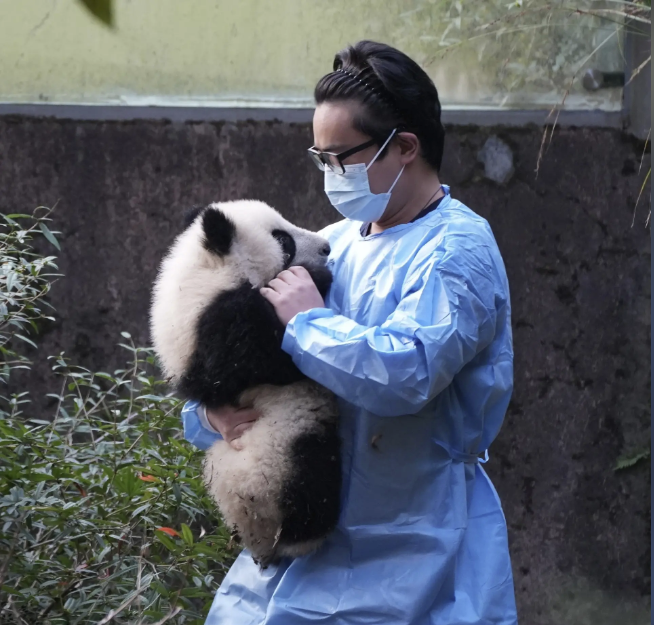 飼養員們非常心疼這隻大熊貓,經常抱在懷裡安慰,還會親切的稱呼福菀為“菀兒”。