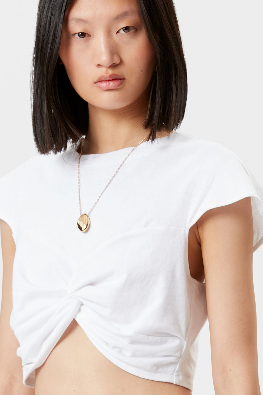 抓褶設計打破家居服的單調結構,隨意又不規整的捏褶設計使衣服下襬呈現獨特的造型感,金屬裝飾的加入使設計更具高級質感。