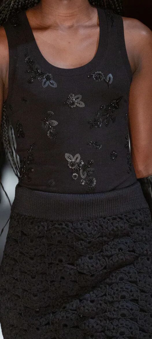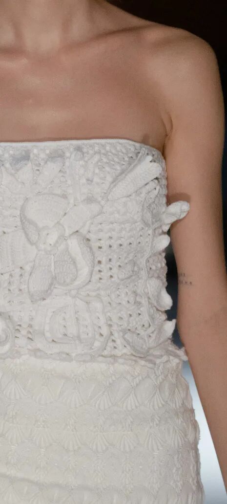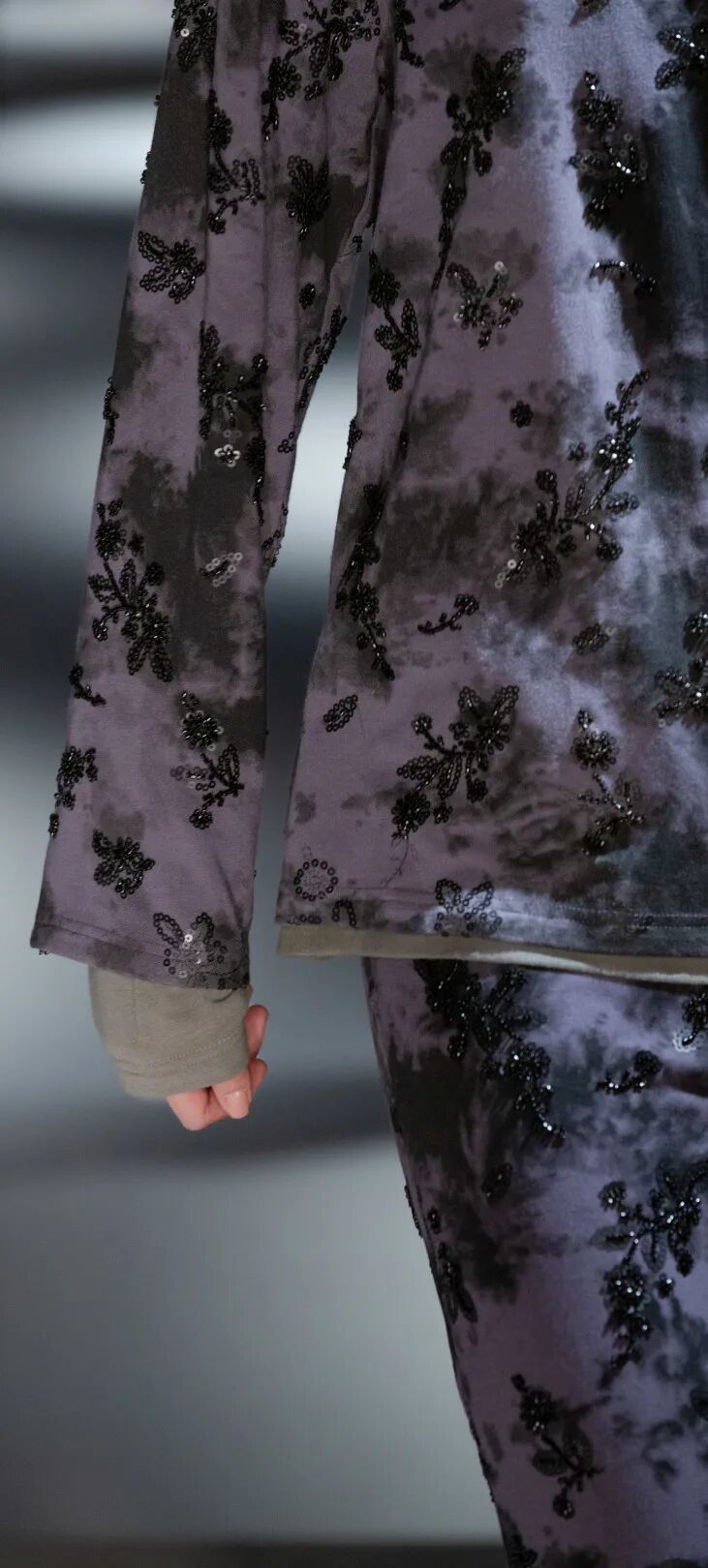 以 3D 打印、珠繡、亮片以及手鉤等多種工藝完成的玫瑰花朵裝飾,低調地綻放在胸前、裙襬與褲腳上,脆弱的花朵因精湛的工藝得以永生,靜靜點綴著一方天地。