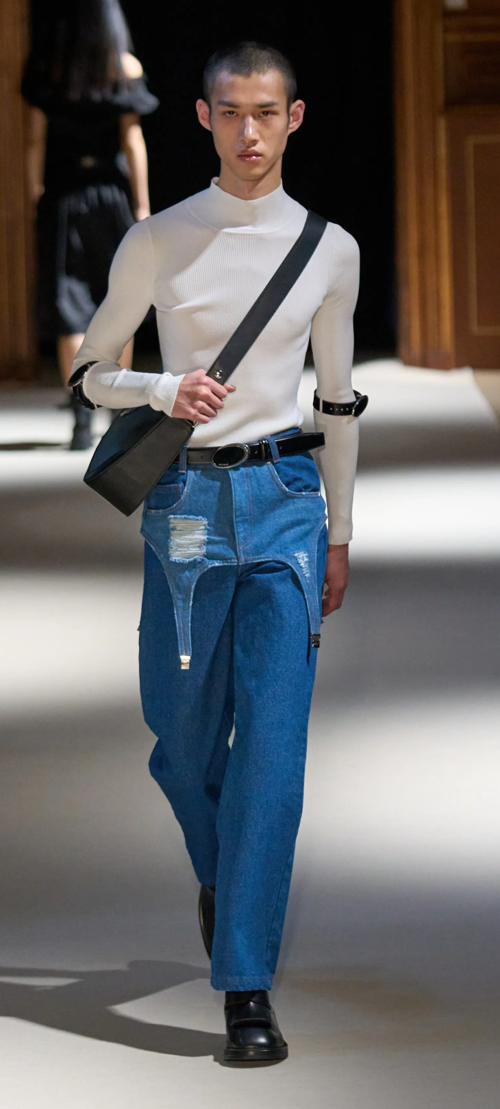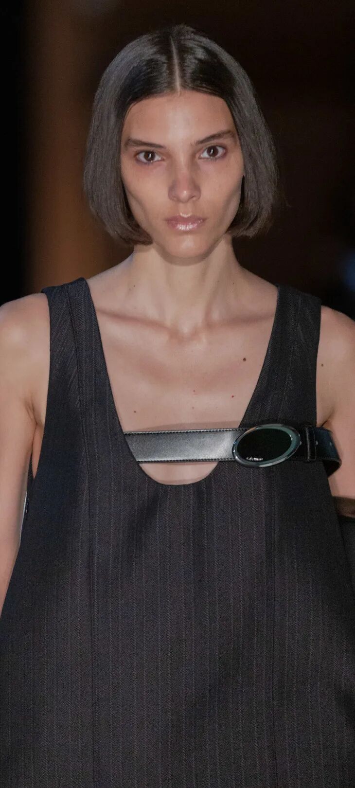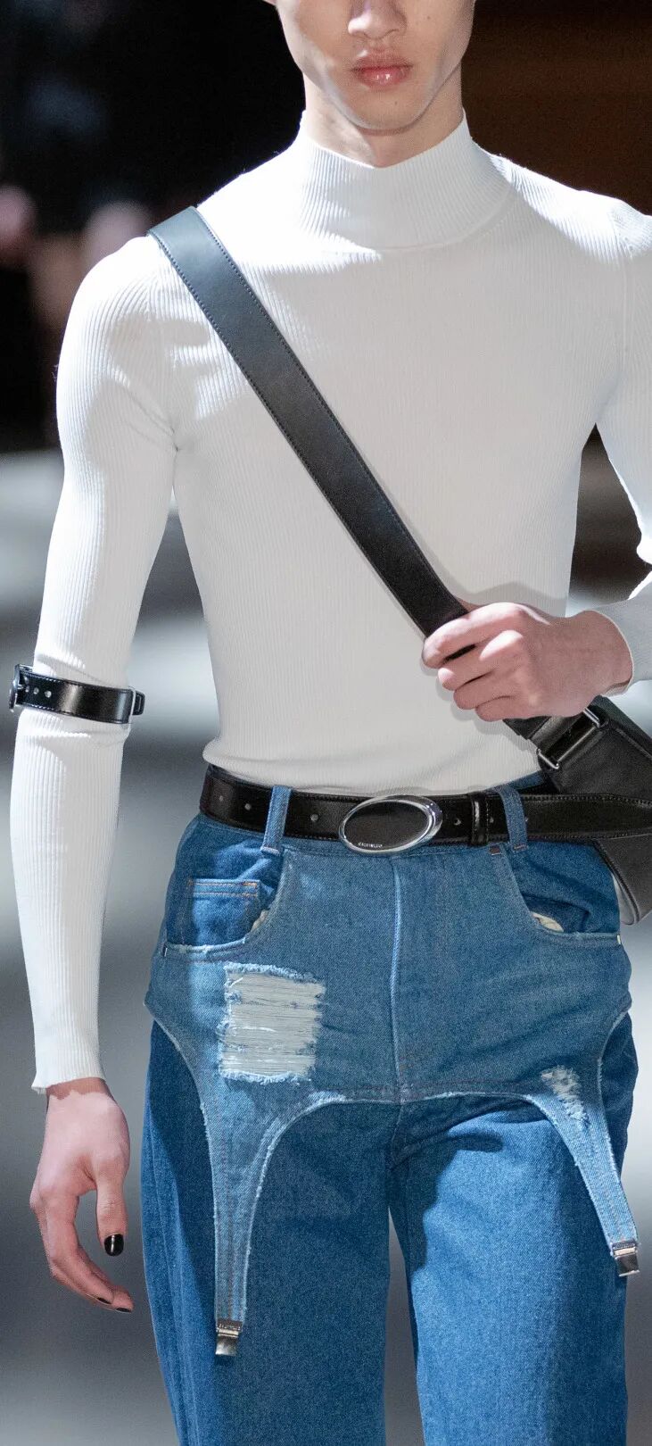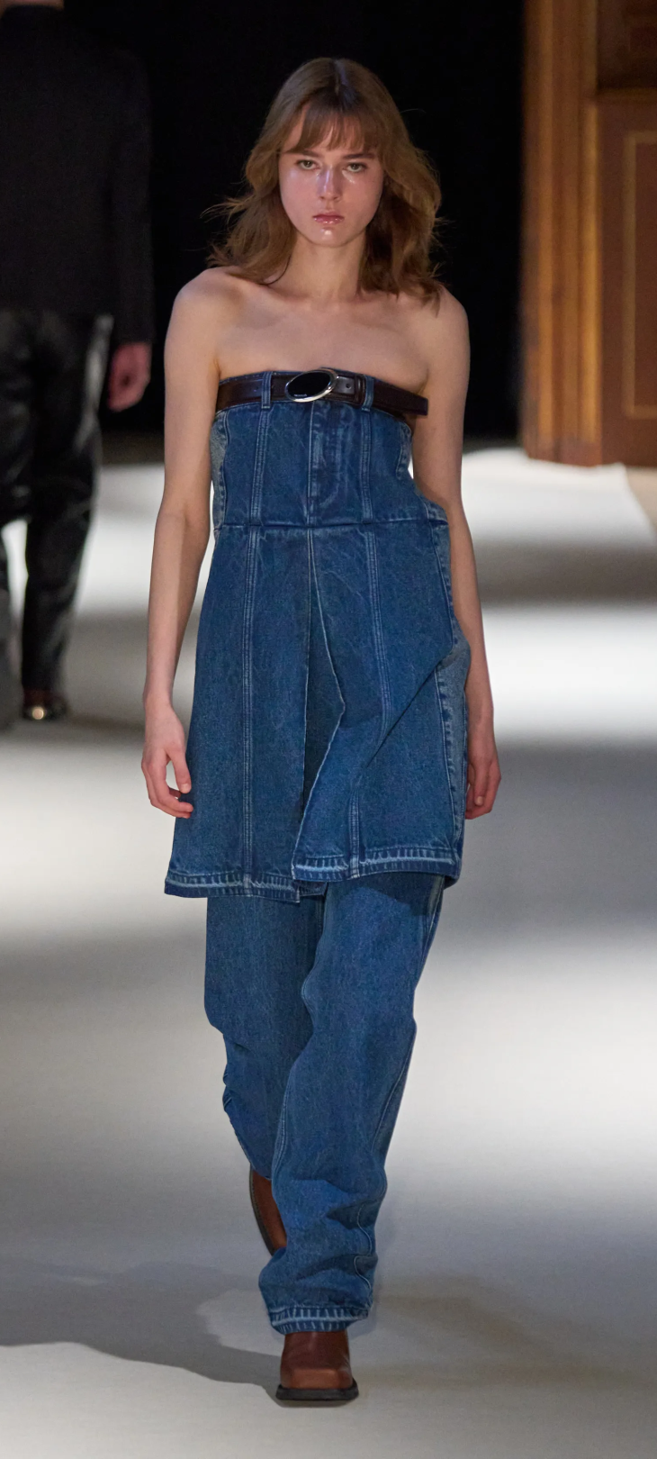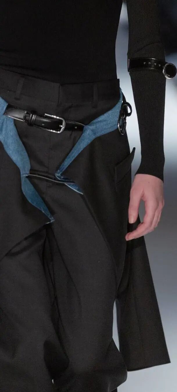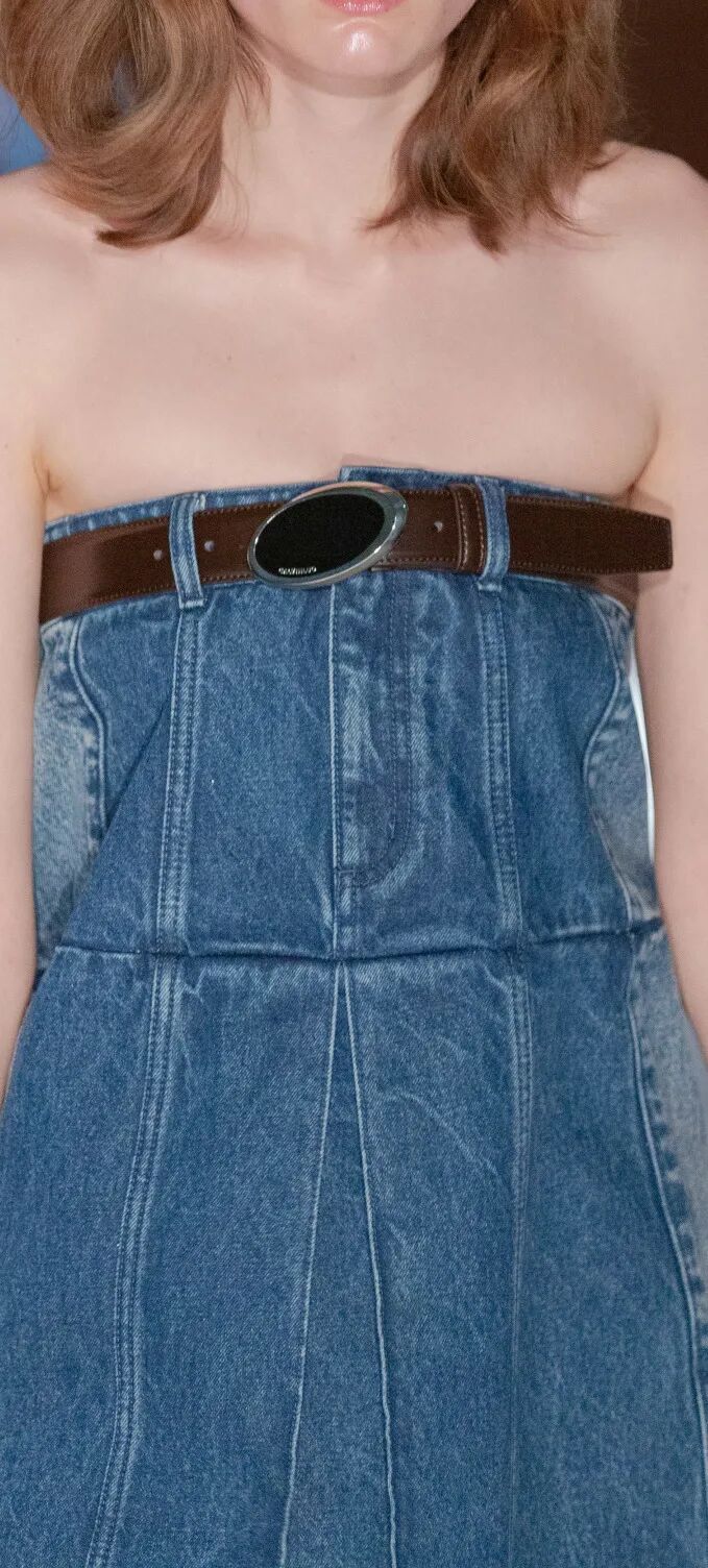 保留原本的功能性作用,同時融入裝飾性設計,不對稱的穿插在吊帶連衣裙的胸前;或是模仿穿著時不經意間的收腰動作,以 Y 字型走向勾勒褲裝腰線,也完成了對牛仔褲廓形的解構;牛仔半裙的版型結構被倒置,腰帶也隨之出現在裙襬邊緣,為造型增添垂墜質感。