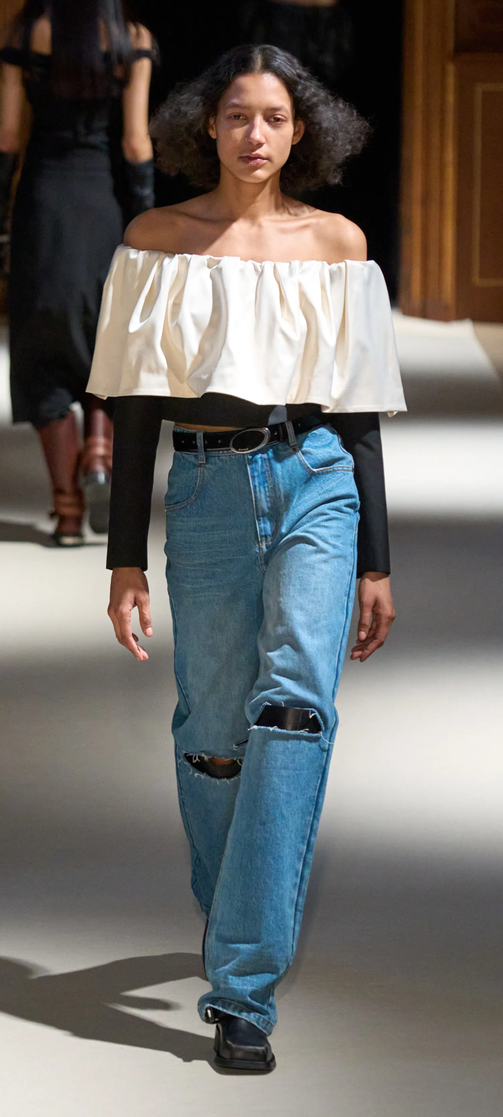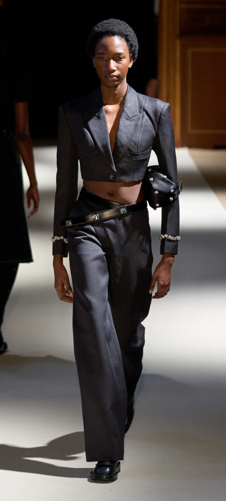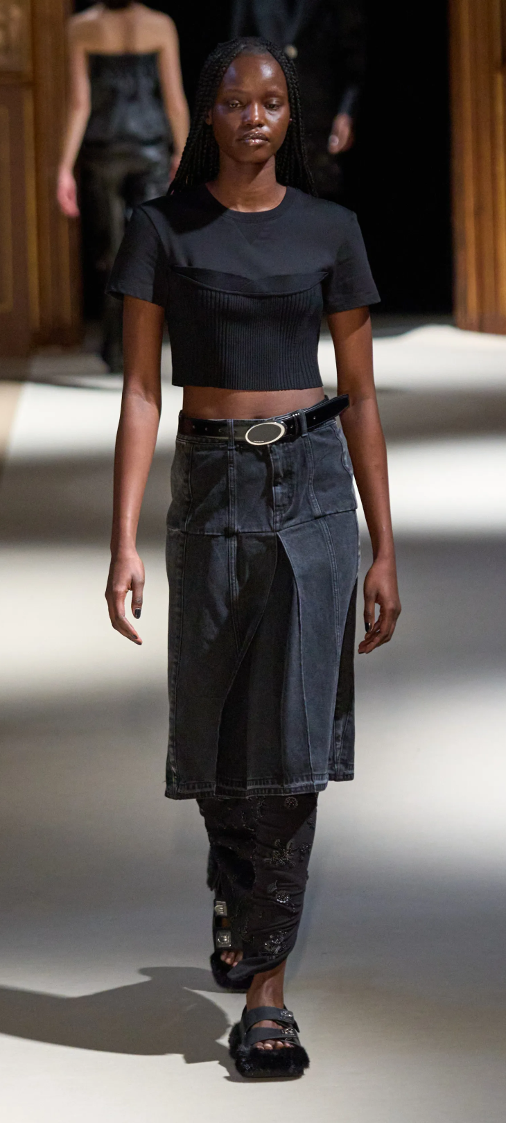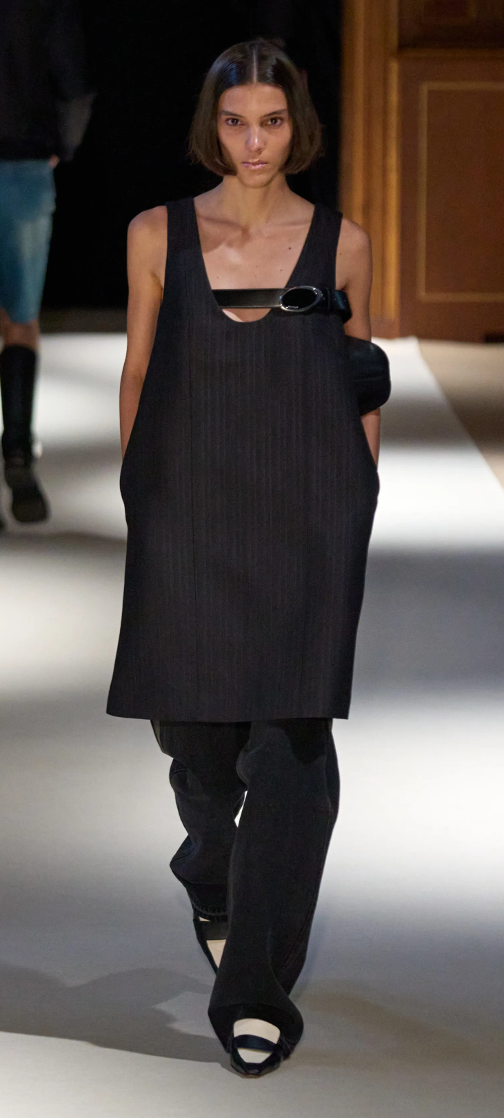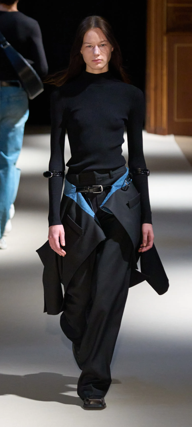 保留原本的功能性作用,同時融入裝飾性設計,不對稱的穿插在吊帶連衣裙的胸前;或是模仿穿著時不經意間的收腰動作,以 Y 字型走向勾勒褲裝腰線,也完成了對牛仔褲廓形的解構;牛仔半裙的版型結構被倒置,腰帶也隨之出現在裙襬邊緣,為造型增添垂墜質感。
