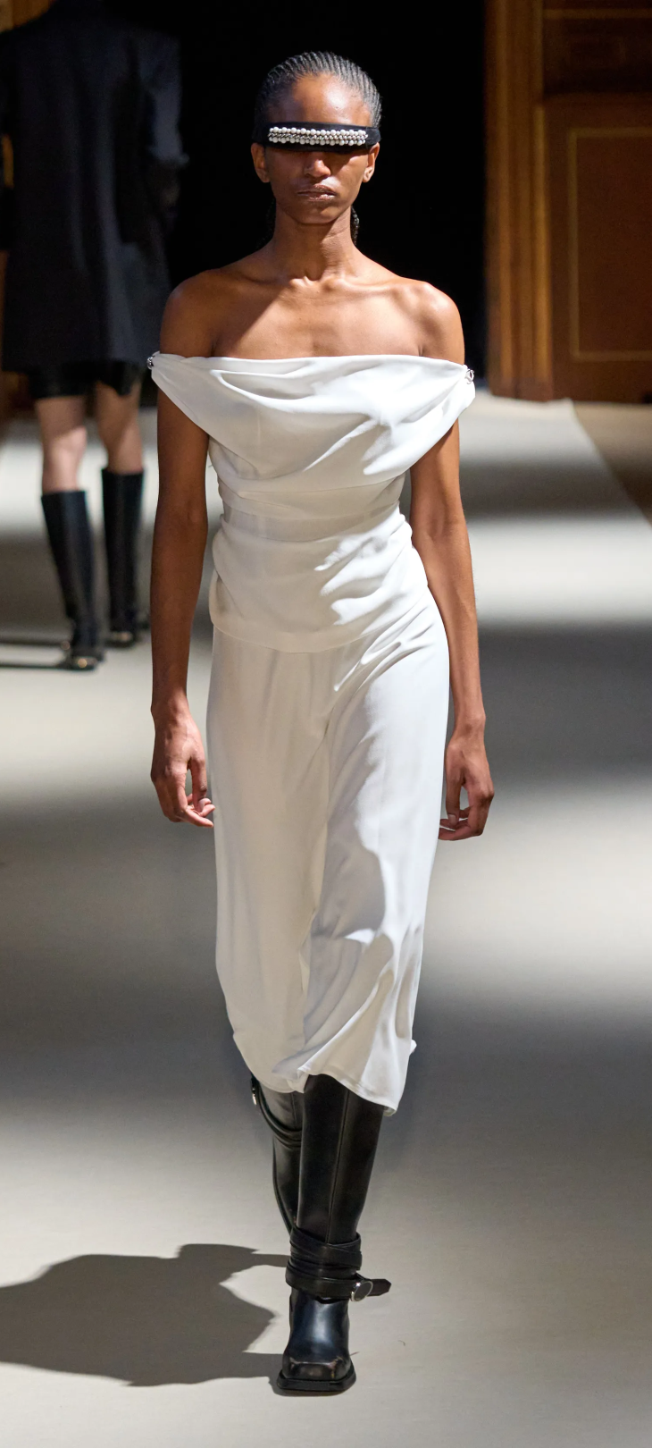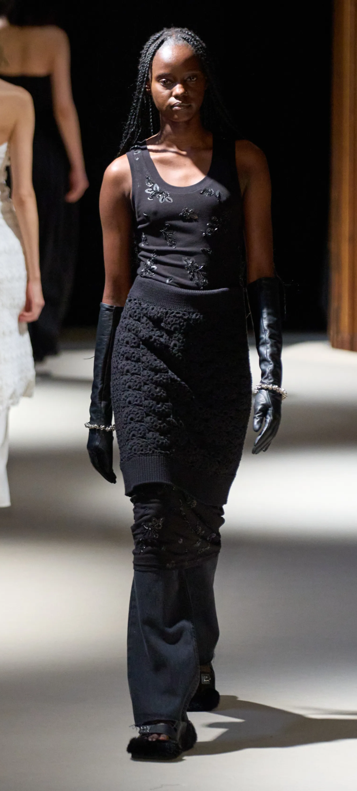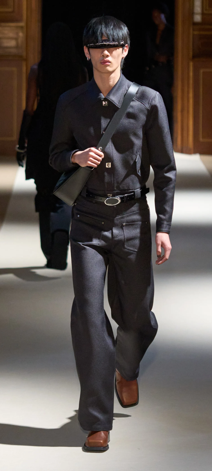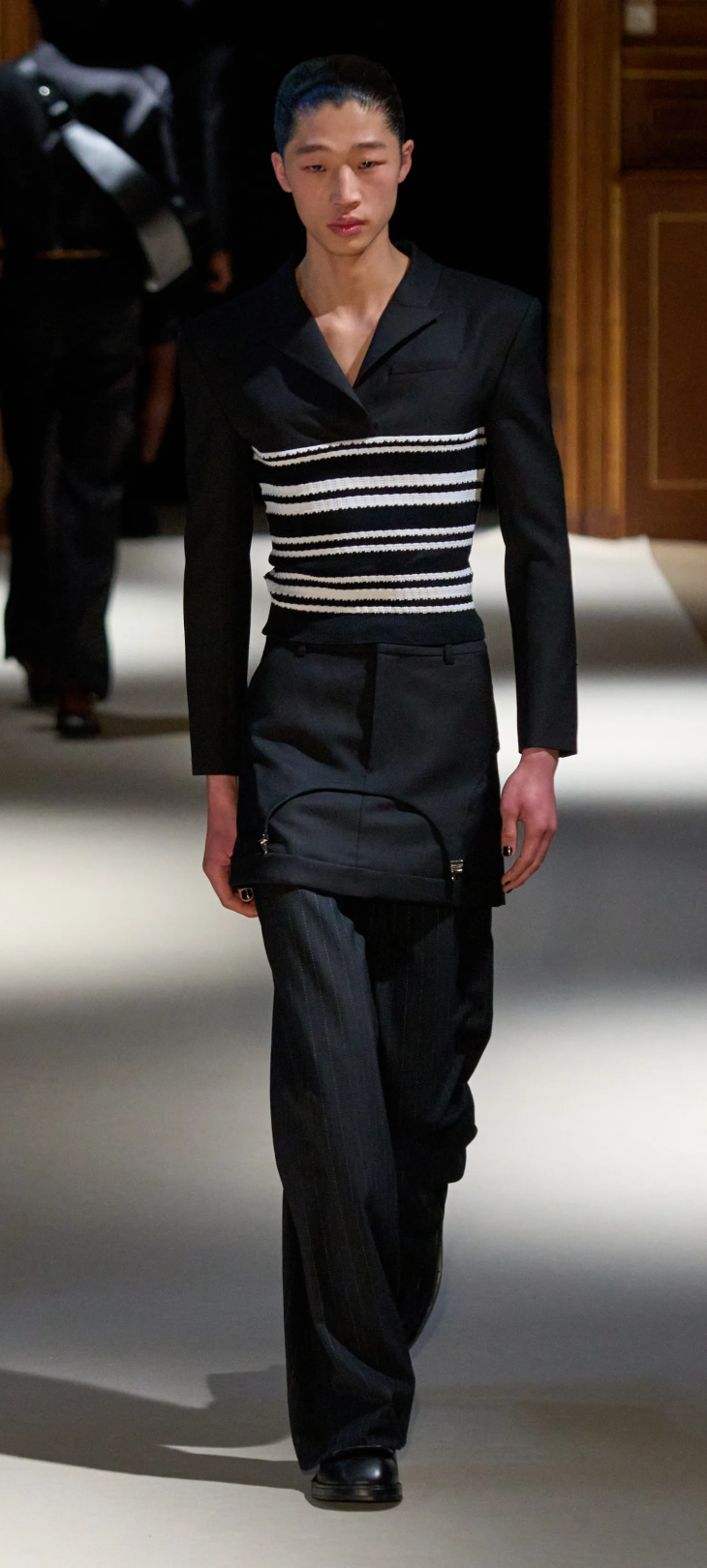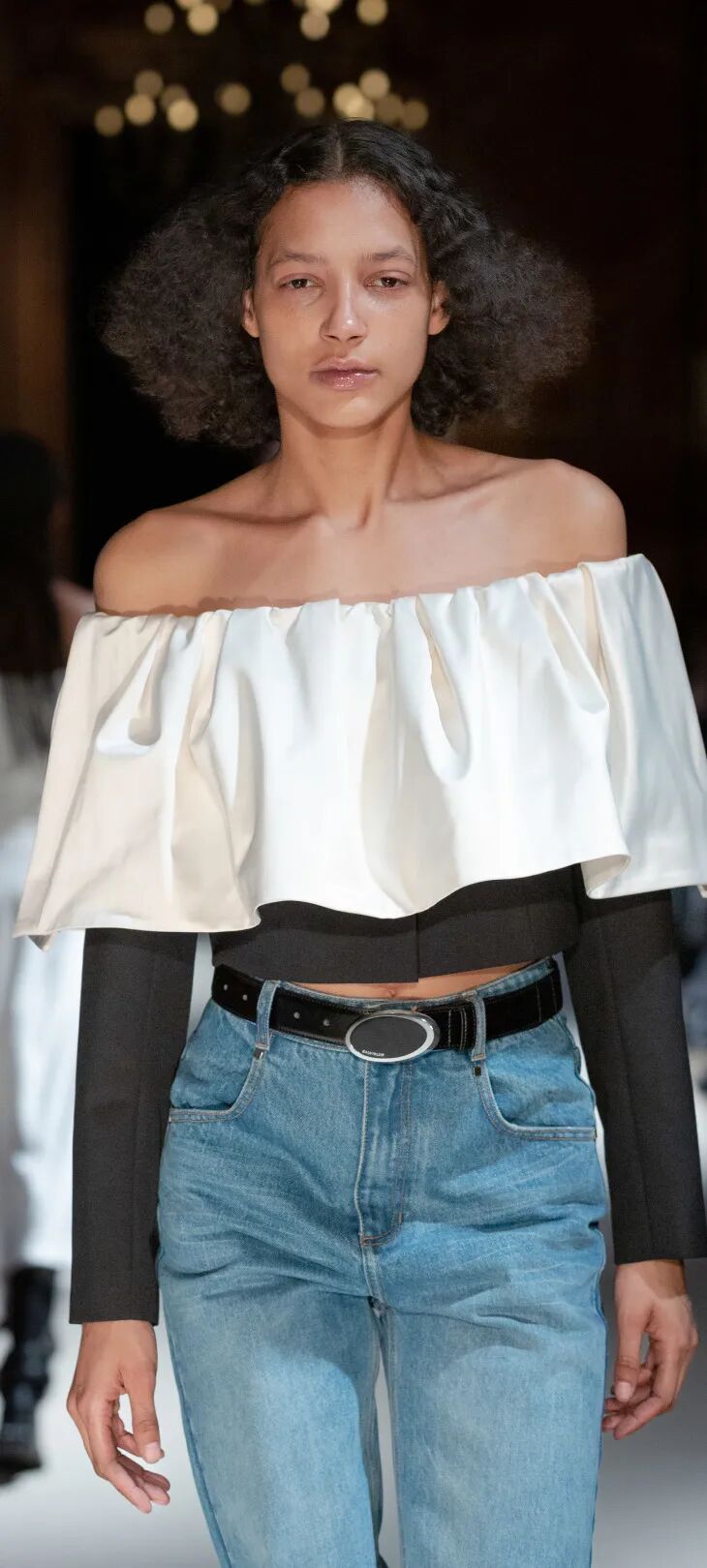 保留原本的功能性作用,同時融入裝飾性設計,不對稱的穿插在吊帶連衣裙的胸前;或是模仿穿著時不經意間的收腰動作,以 Y 字型走向勾勒褲裝腰線,也完成了對牛仔褲廓形的解構;牛仔半裙的版型結構被倒置,腰帶也隨之出現在裙襬邊緣,為造型增添垂墜質感。
