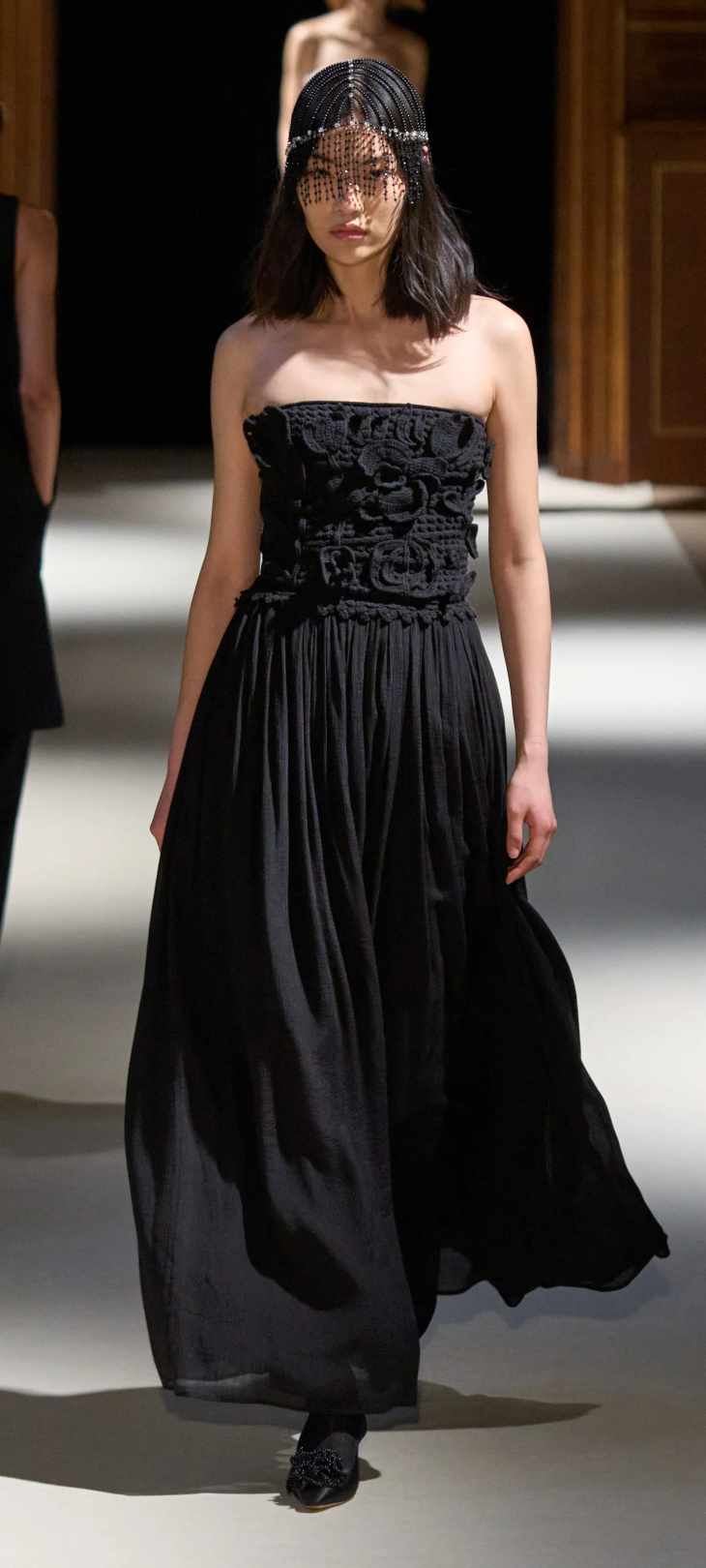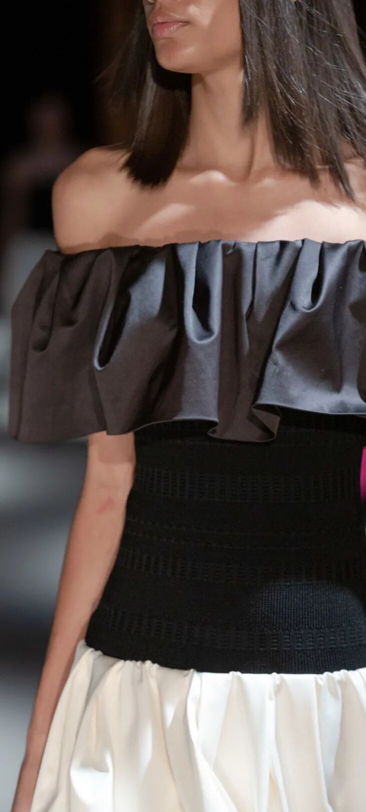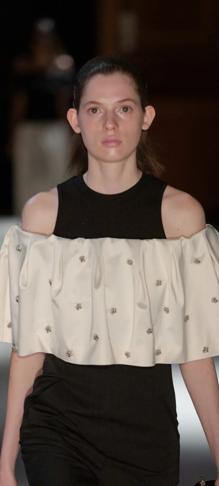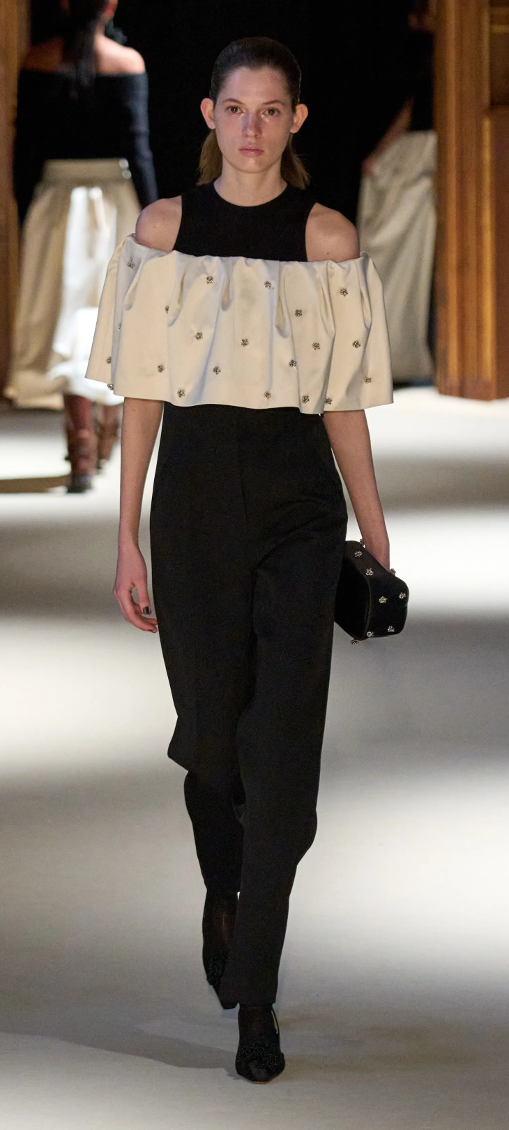 越是在不經意中盛放的花蕾越是迷人。品牌標誌性的黑色西裝與塔夫綢打造的花苞狀褶皺一起,通過針織面料完成了一場夢境與現實的聯結,定格腦海中浮現出的轉瞬即逝的美麗。