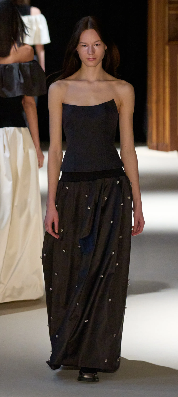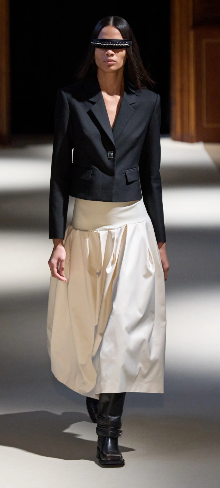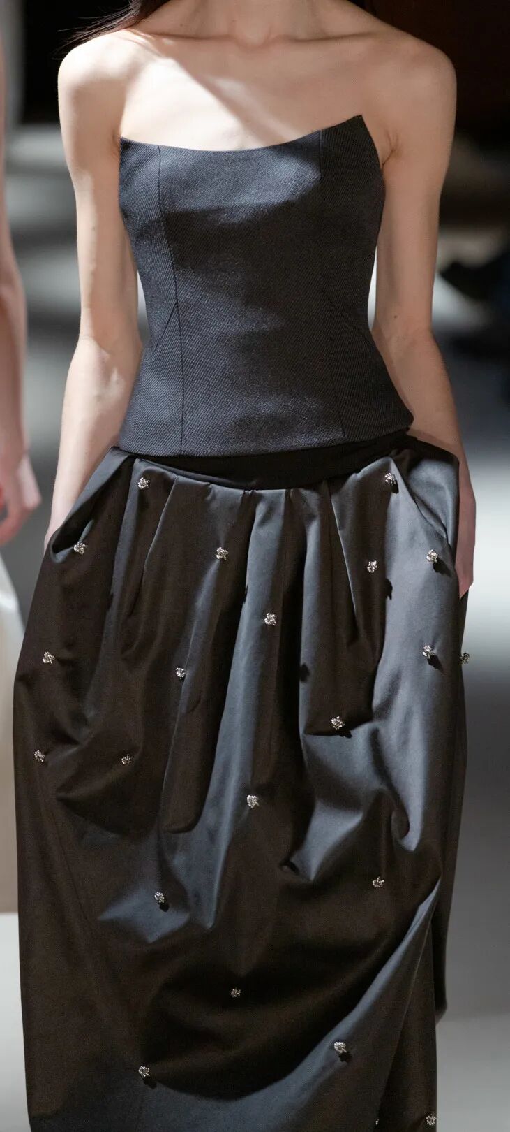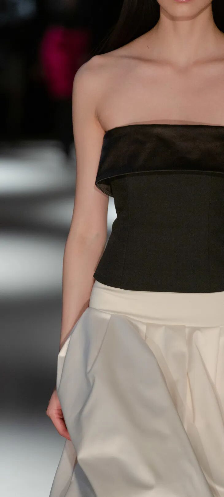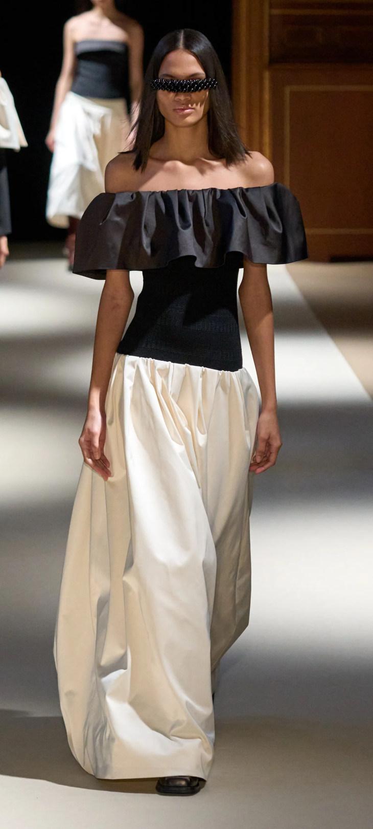 越是在不經意中盛放的花蕾越是迷人。品牌標誌性的黑色西裝與塔夫綢打造的花苞狀褶皺一起,通過針織面料完成了一場夢境與現實的聯結,定格腦海中浮現出的轉瞬即逝的美麗。