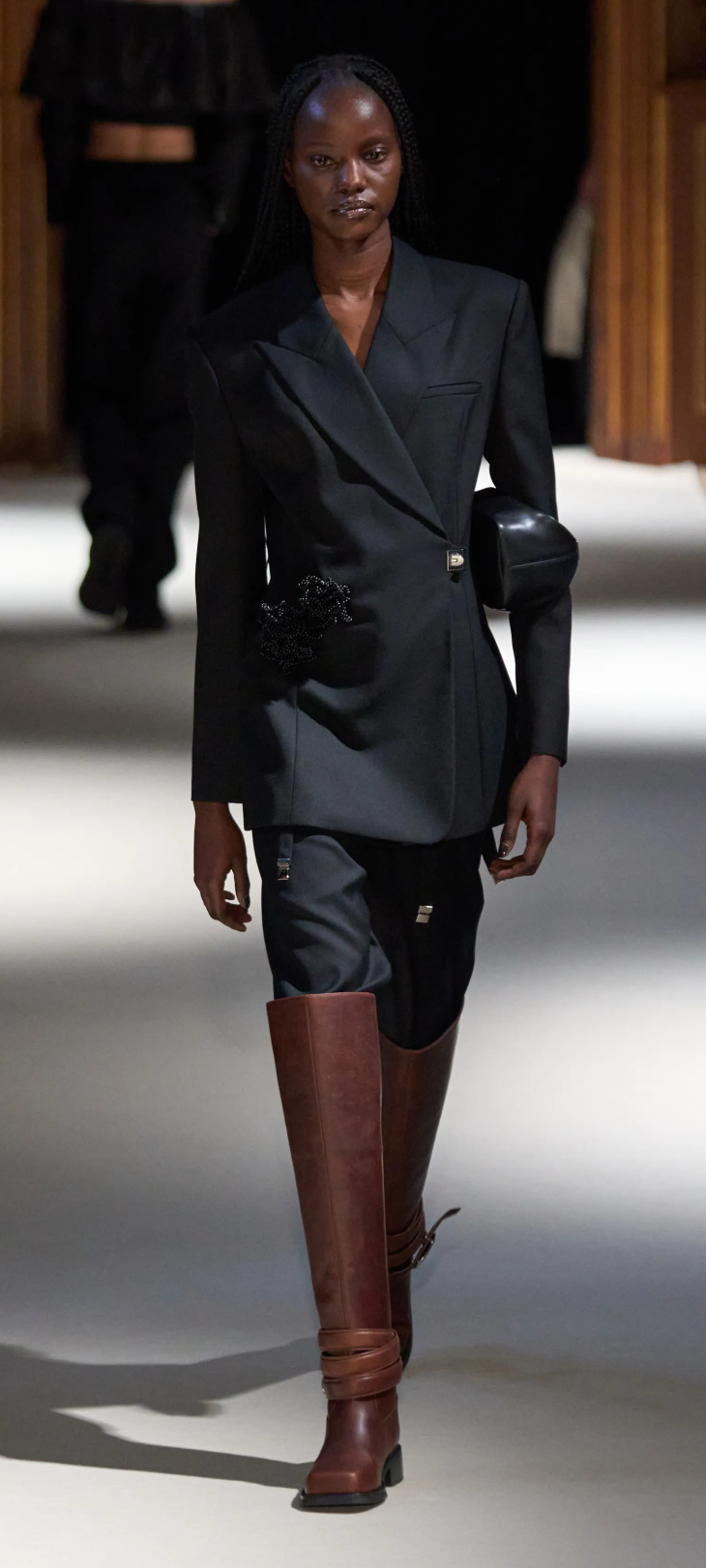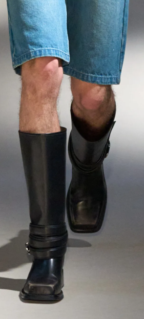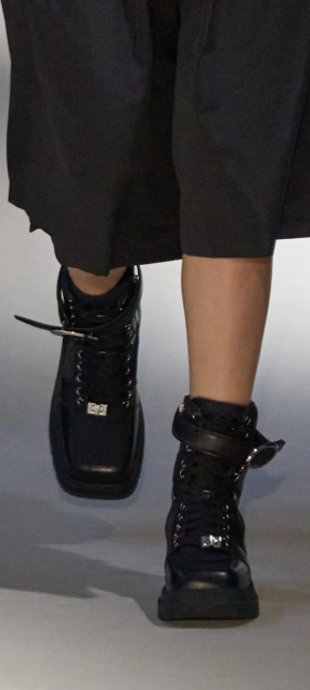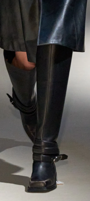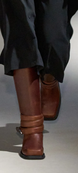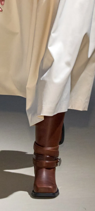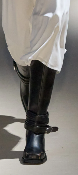 多層纏繞的腰帶元素出現在方頭長靴的及踝處,而長方形系口也裝點於樂福鞋與高跟鞋鞋面之上,呈現出秩序美感。