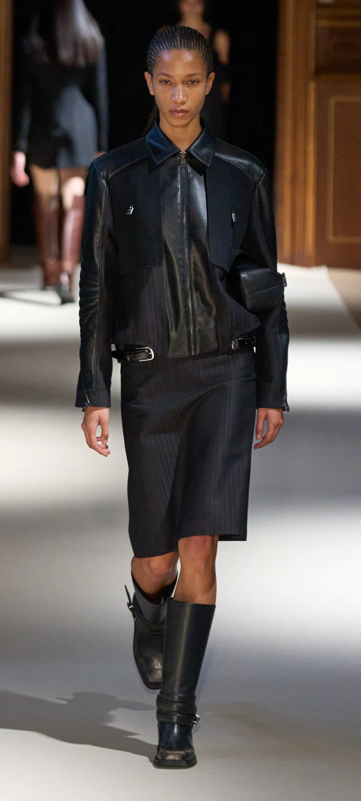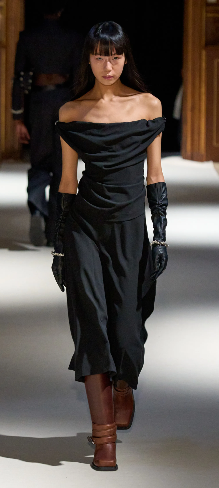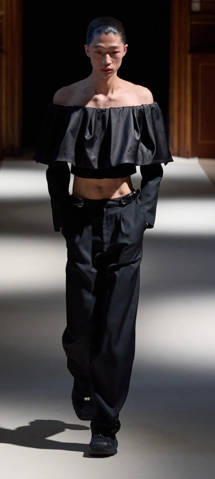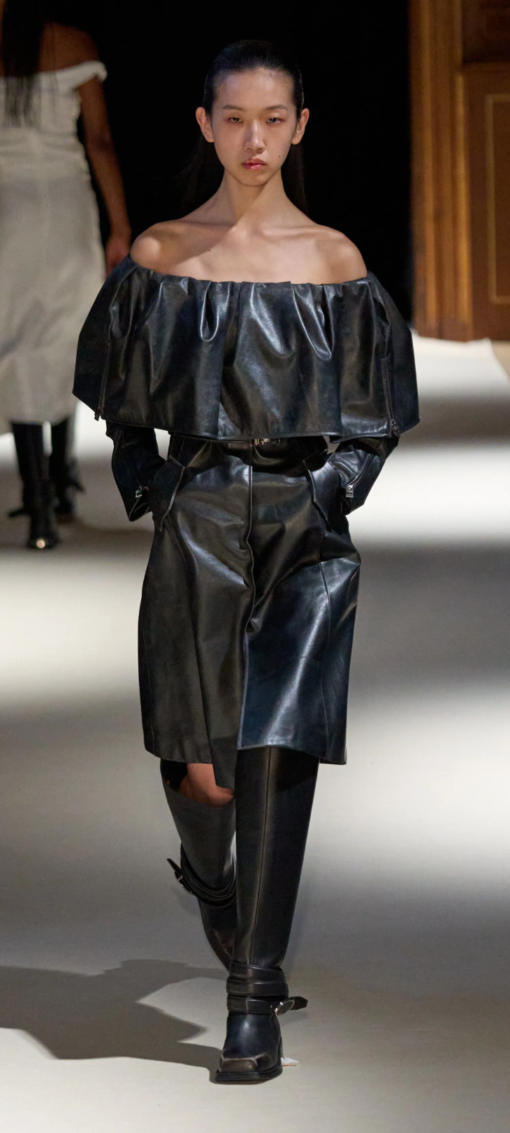 露肩荷葉邊襯衫款式是該系列的主角,由皮革或緞子製成,飾有鉚釘裝飾。