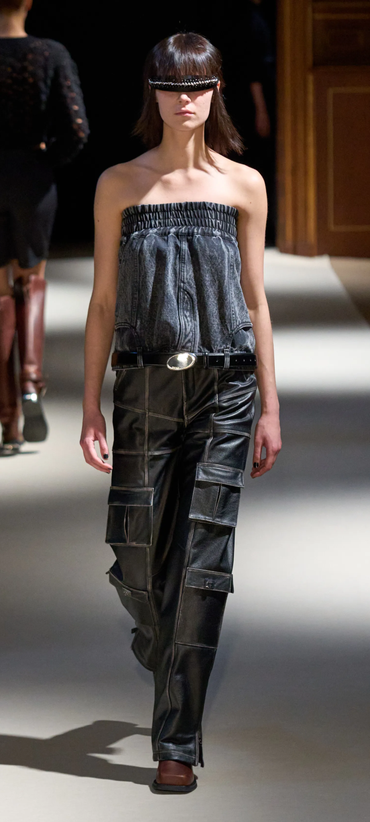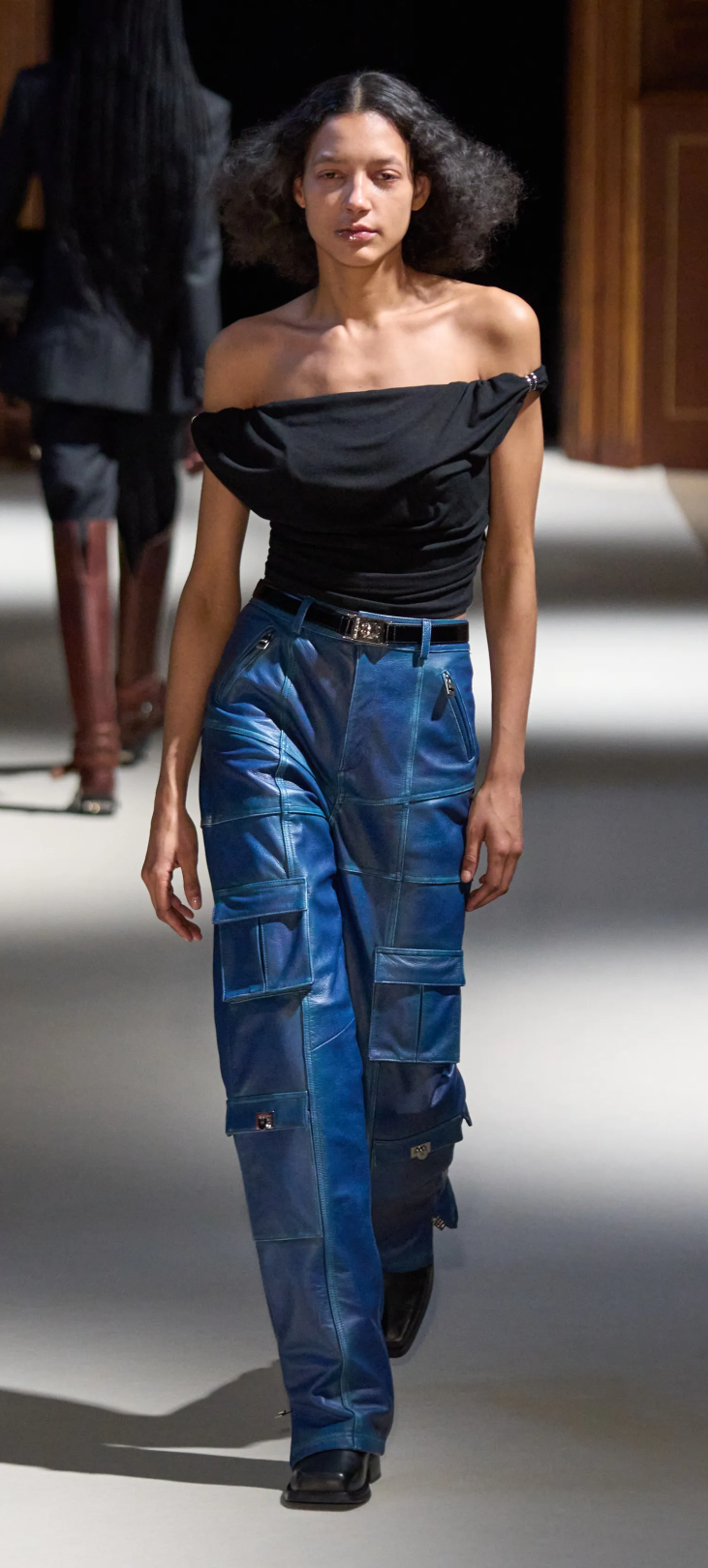 一件倒置牛仔褲形態的抹胸上衣配了拼接皮革工裝褲,更像是連身褲;藍色皮革材質工裝褲經過手工做舊處理,看上去像一條牛仔褲,混合材質的碰撞非常有趣。