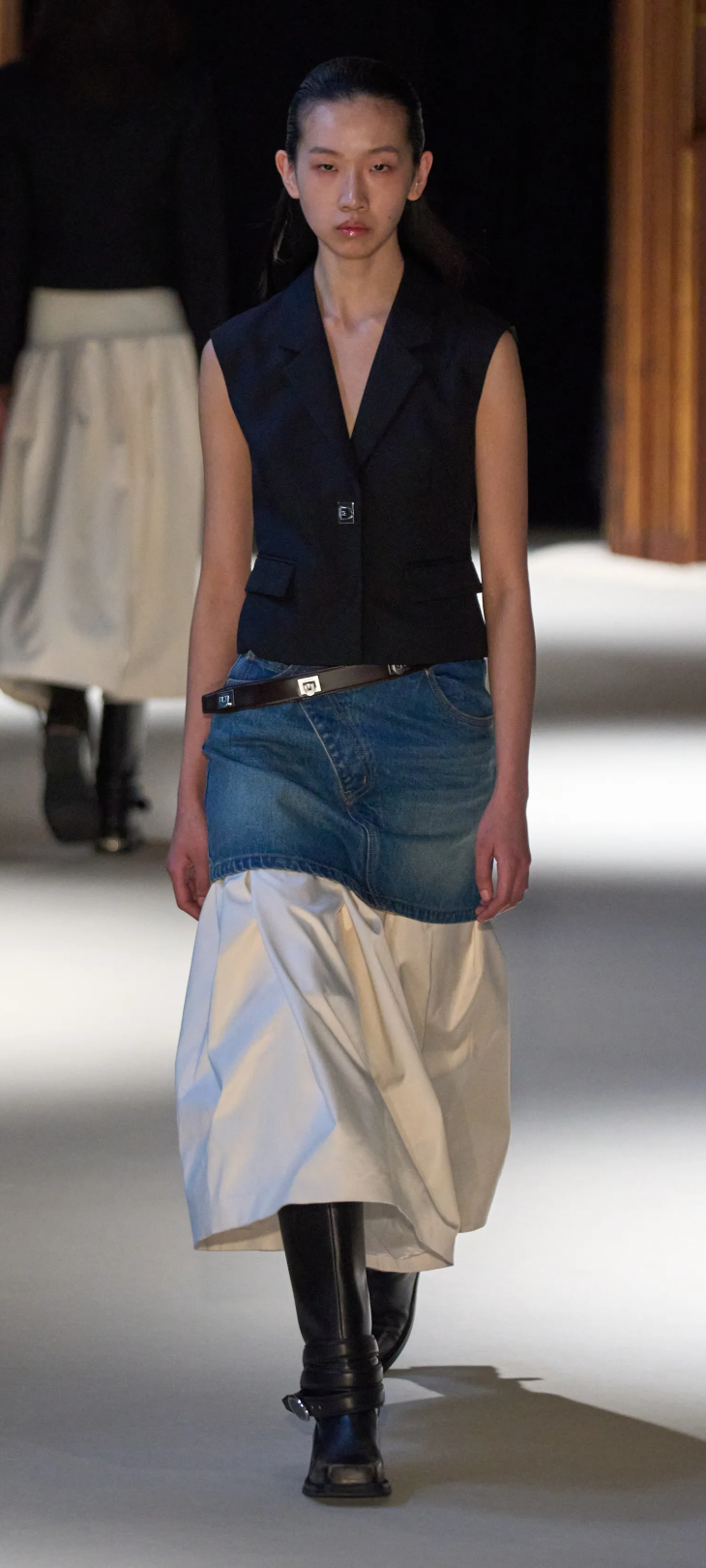 一件黑色七分西裝外套搭配了一條白色過膝裙,實際上這是一條連衣裙;而另一件類似的由西裝馬甲搭配的連衣裙增加了牛仔元素,帶來意想不到的層次感。