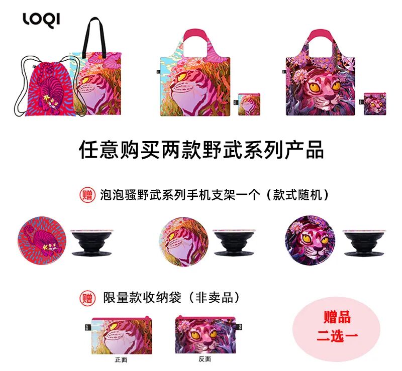 野武聯名款系列中,好奇虎與希望虎兩款環保袋售價98元,雙面&束口包售價178元,野武系列下單任意2件可獲贈品收納袋一個或者野武系列手機支架一個(款式隨機)!