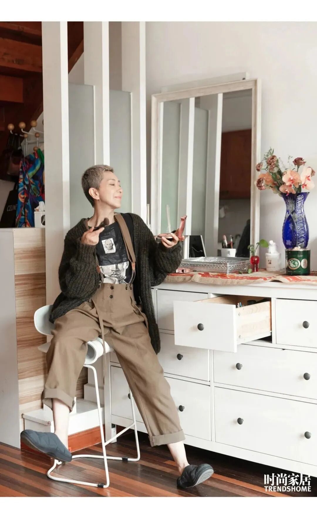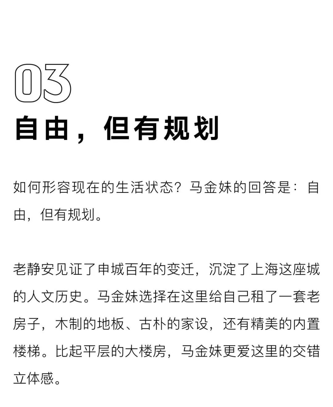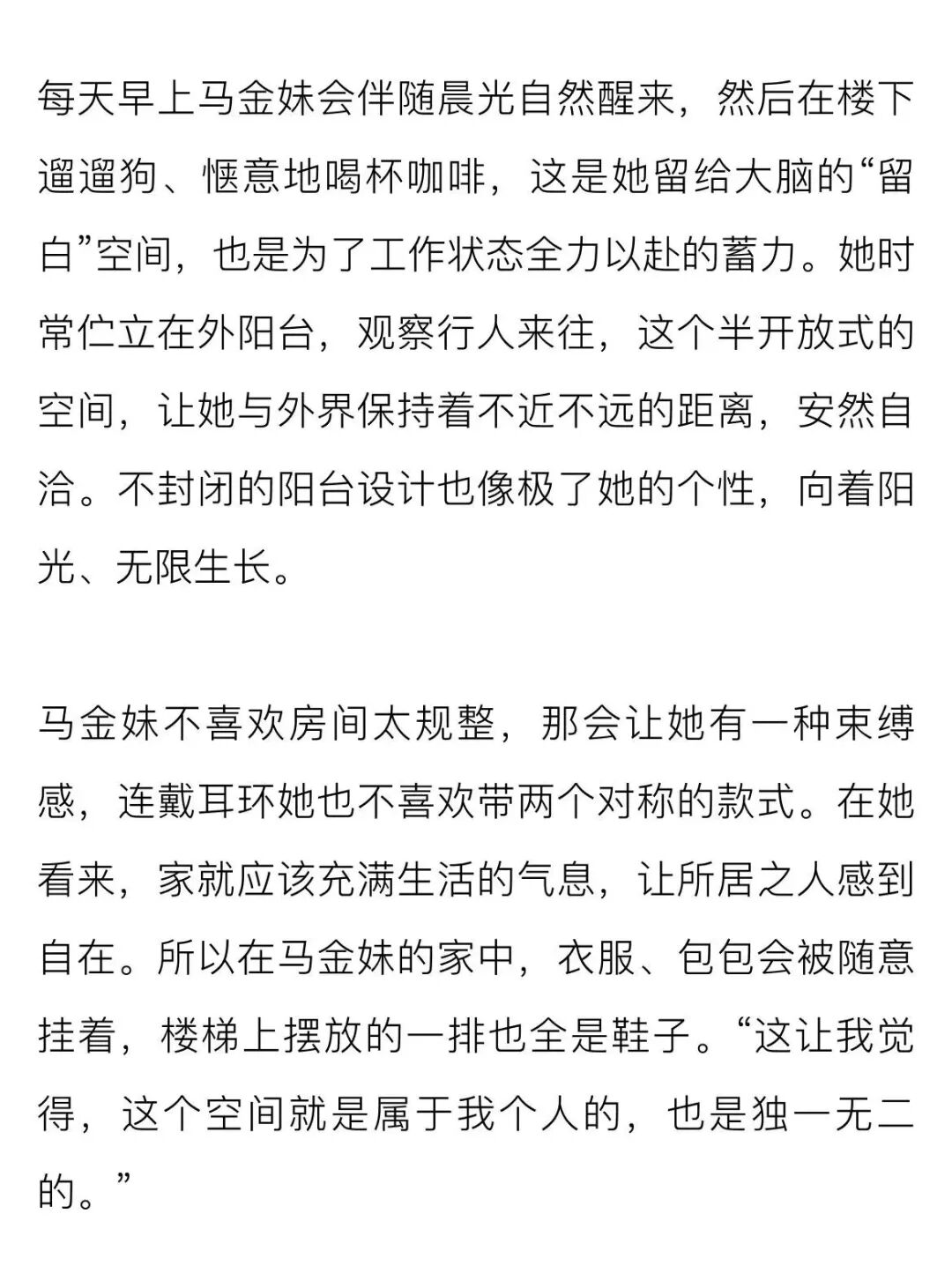 生活空間不必規整安排,但這也並不妨礙馬金妹追求生活的精緻與儀式感。她喜歡家裡的每一處空間,會泡在浴缸裡,點上一支香氛蠟燭,播放一首輕柔的音樂,自言自語,想象自己是在和大自然對話;會在客廳擺放一束明媚的鮮花,隨機放映一部中世紀的法國電影,讓自己恍若穿越時空;她也享受廚房的獨處時光,創造美味,也慰藉自己的胃與心……