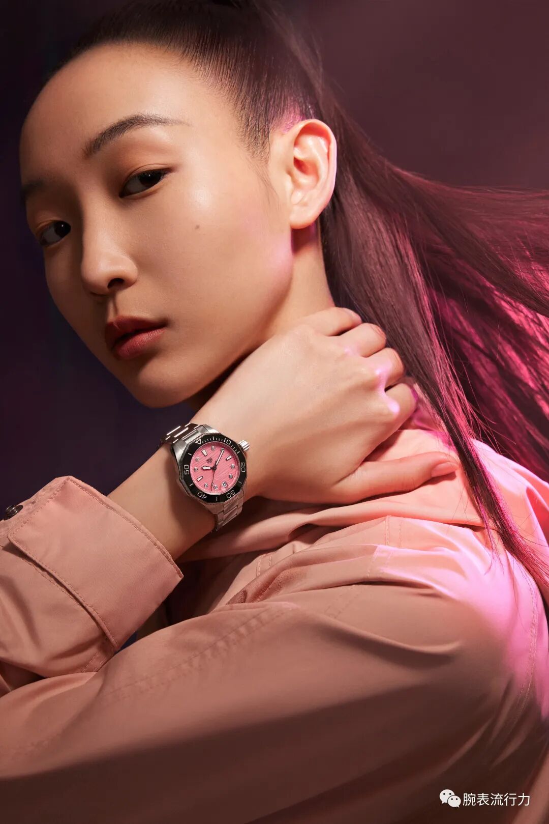 泰格豪雅競潛系列(Aquaracer)兼備卓絕運動元素與出眾性能,大膽又不失優雅的風格,不僅為工作場合和玩樂情境而設計,更可應對自然界的種種嚴峻挑戰,這正是泰格豪雅無所畏懼、先鋒前衛的品牌精神的一種純正象徵,助力當代獨立女性無懼前行探索,敢於超越邊界。這款競潛系列 Professional 300腕錶採用了直徑43毫米的精細磨砂拋光精鋼錶殼,十二邊的單向旋轉表圈採用耐磨的黑色陶瓷材質,稜面設計便於佩戴者抓握並轉動表圈。錶盤採用炫目鮮明的粉色,飾有著象徵著大海的波浪紋理,並鑲嵌8顆直徑1.40毫米的VS級鑽石,與潛水腕錶的運動風格搭配,呈現出時尚前衛的甜酷風格。腕錶在錶殼、表圈和金屬錶鏈的設計上充分符合人體工學原理,在保證腕錶的核心性能特徵的同時,增加佩戴舒適感,陪伴擁有多重人生角色的女性輕鬆駕馭各種場合,詮釋無畏成規的百變姿態。