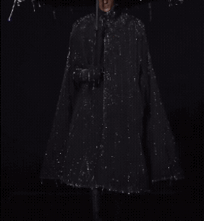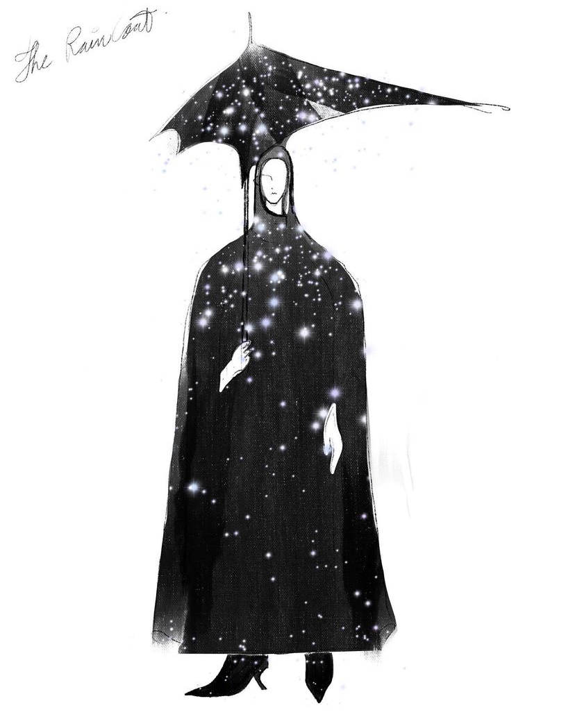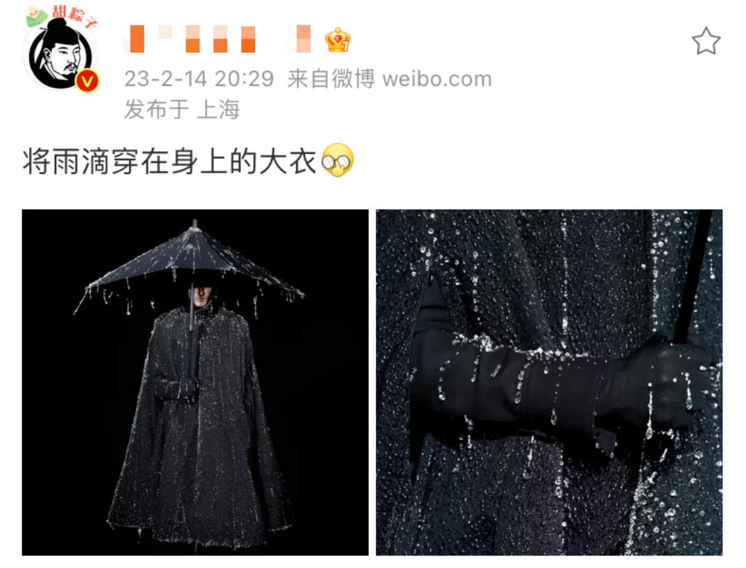 外套的面料是絲綢+塔夫綢,雨滴則由水晶製成。