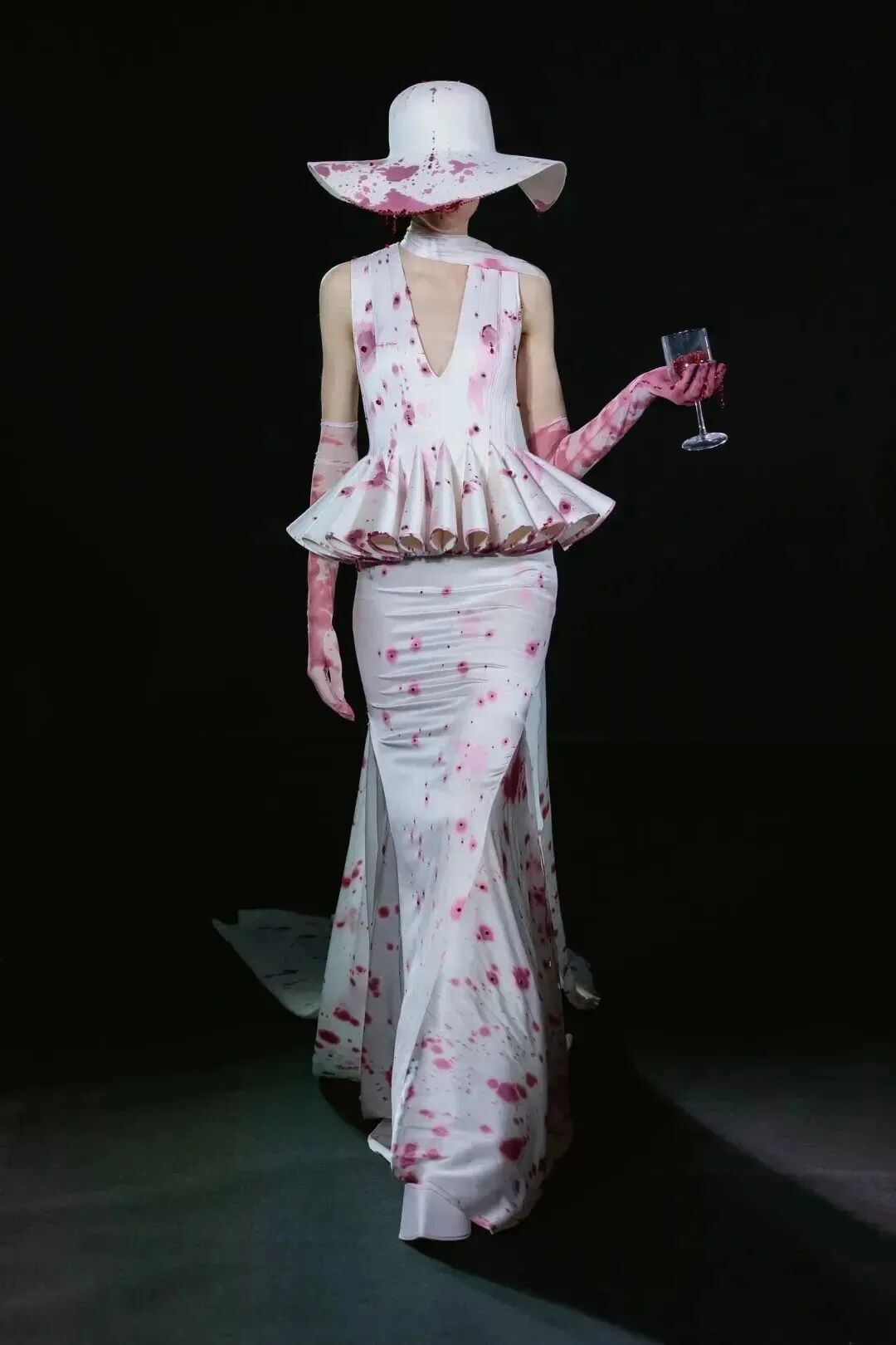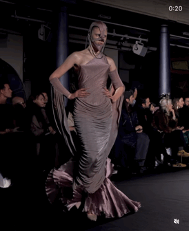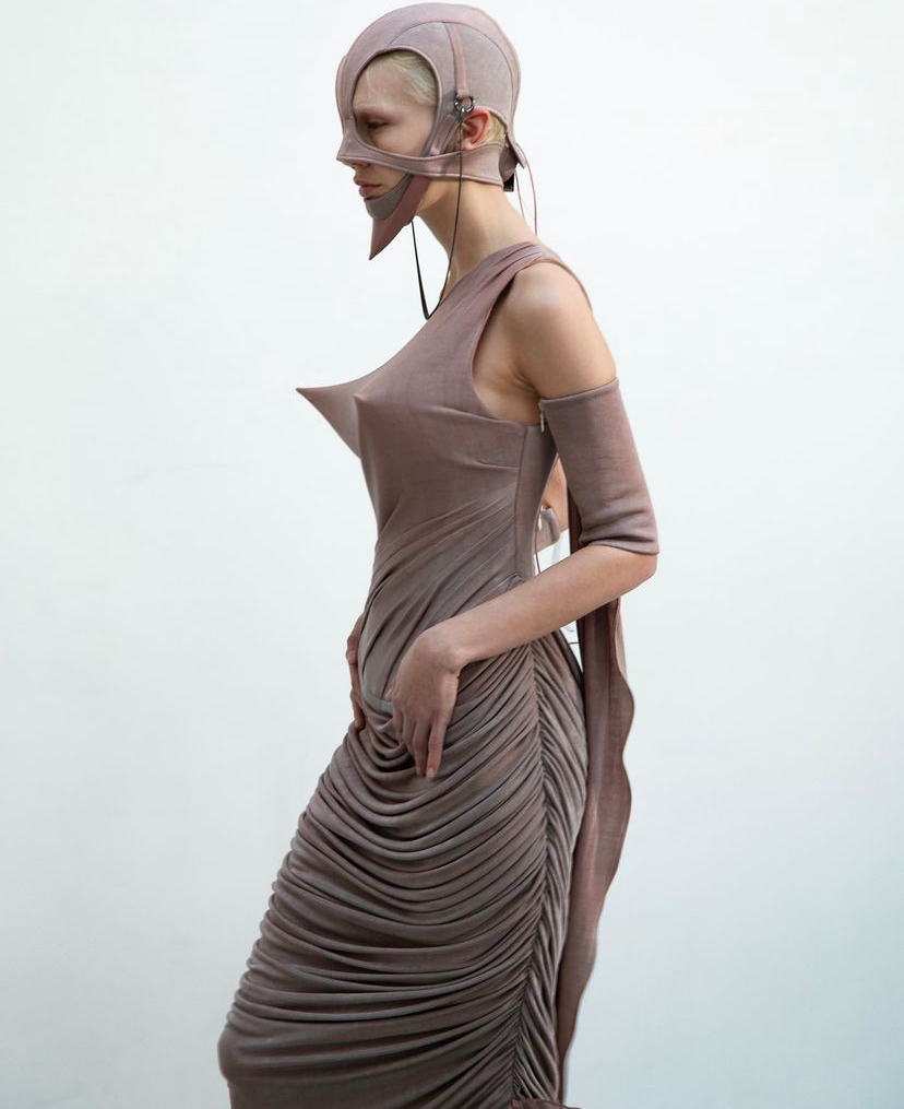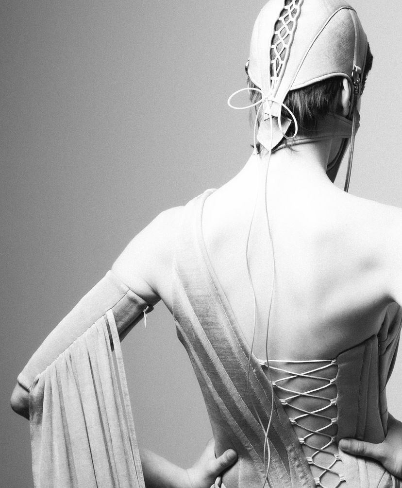 擺動起來彷彿花朵的「繃帶禮服」,唯美也只存在於模特形若綻放花朵的腳邊,頭部和後背的綁帶以及胸前的錐形結構都預示著危險。