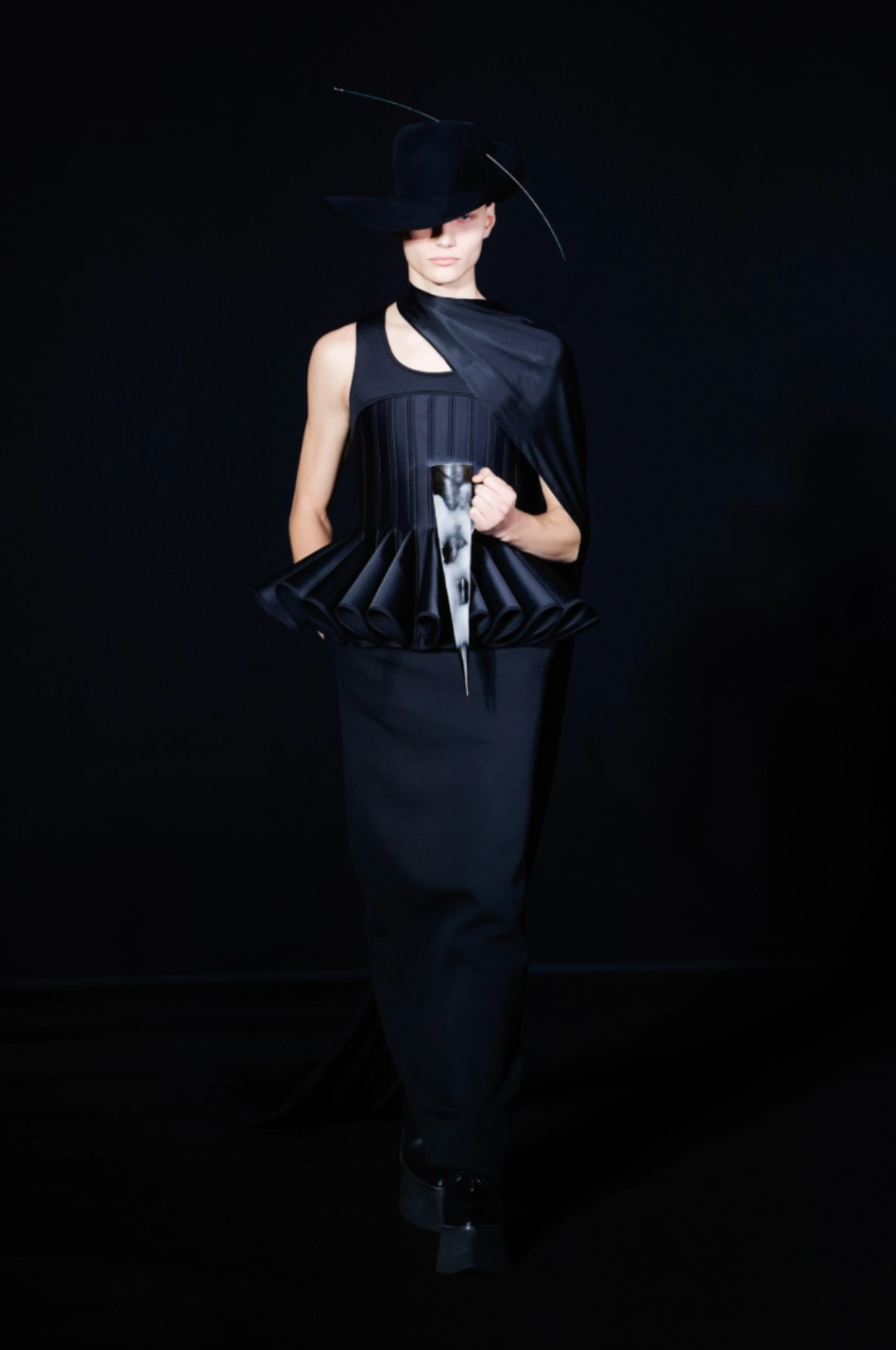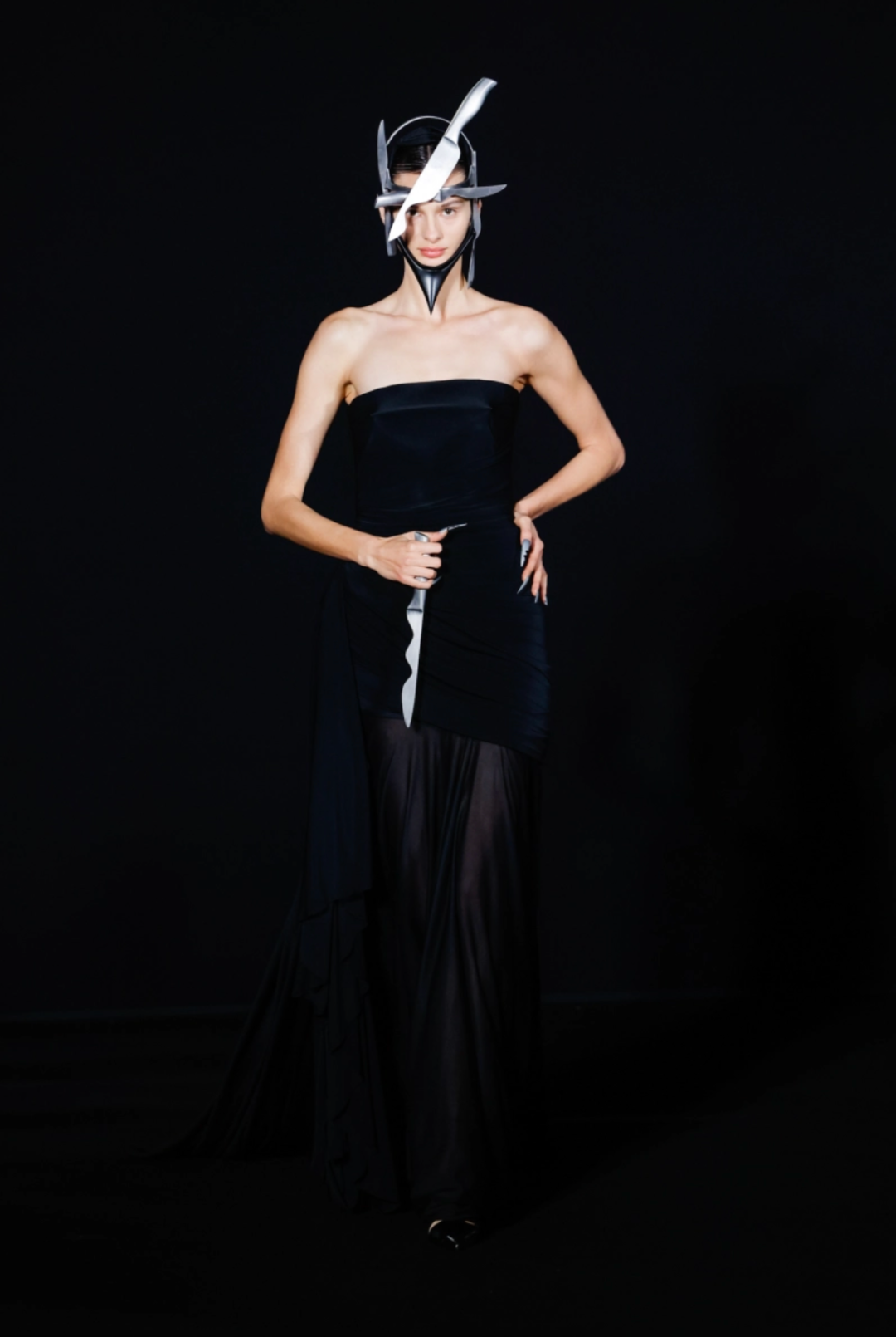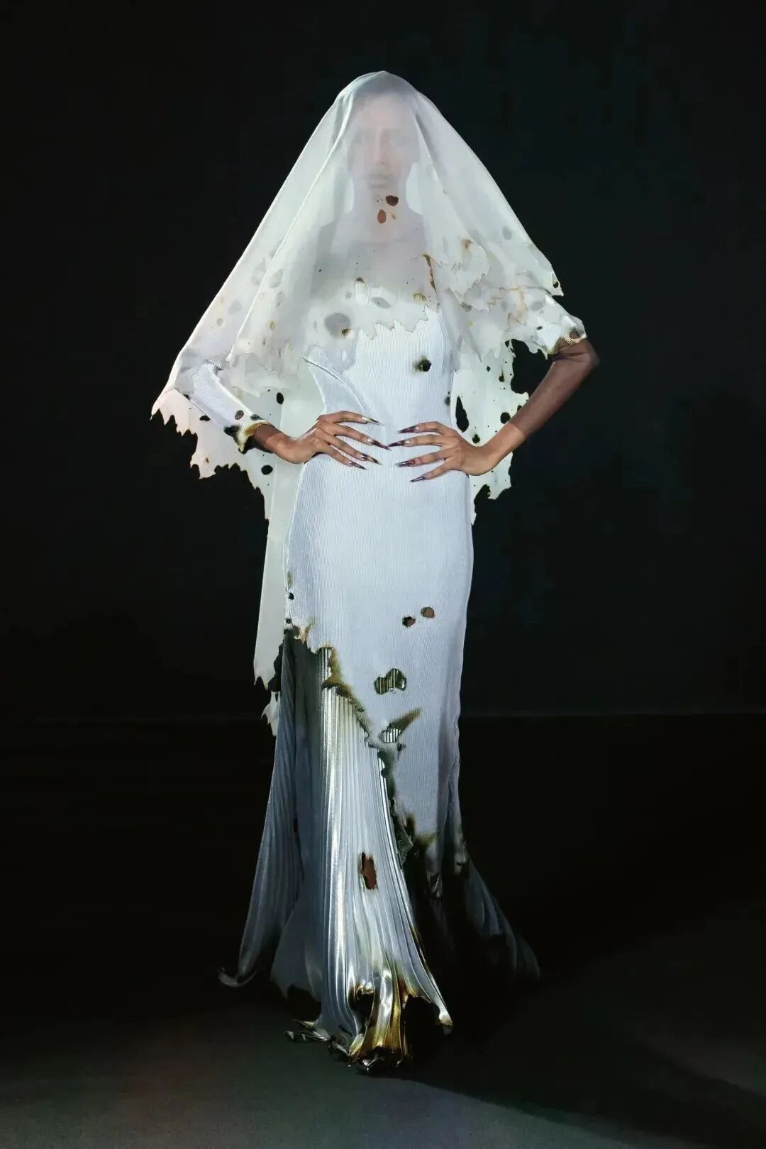 擺動起來彷彿花朵的「繃帶禮服」,唯美也只存在於模特形若綻放花朵的腳邊,頭部和後背的綁帶以及胸前的錐形結構都預示著危險。
