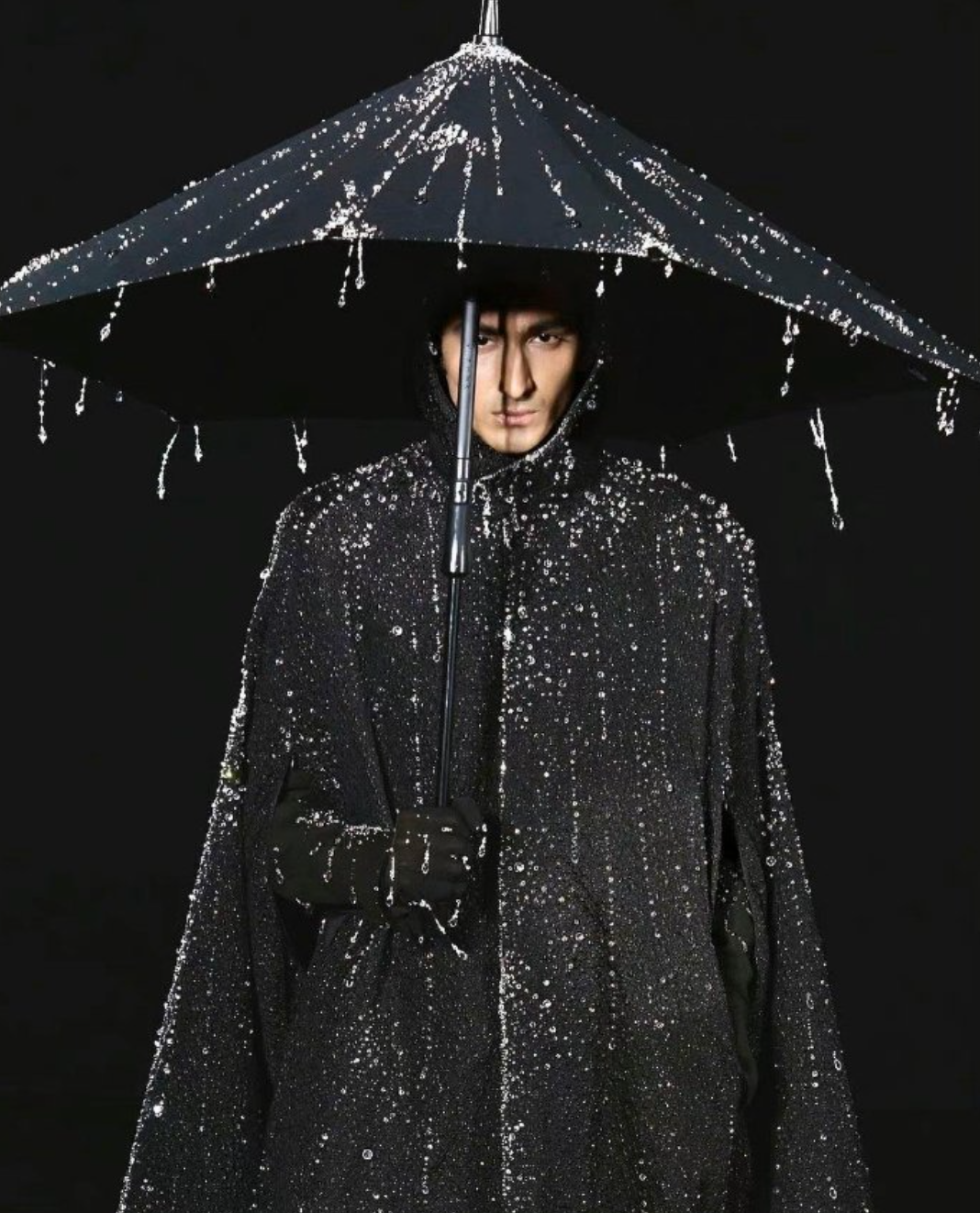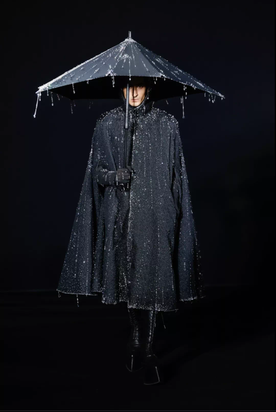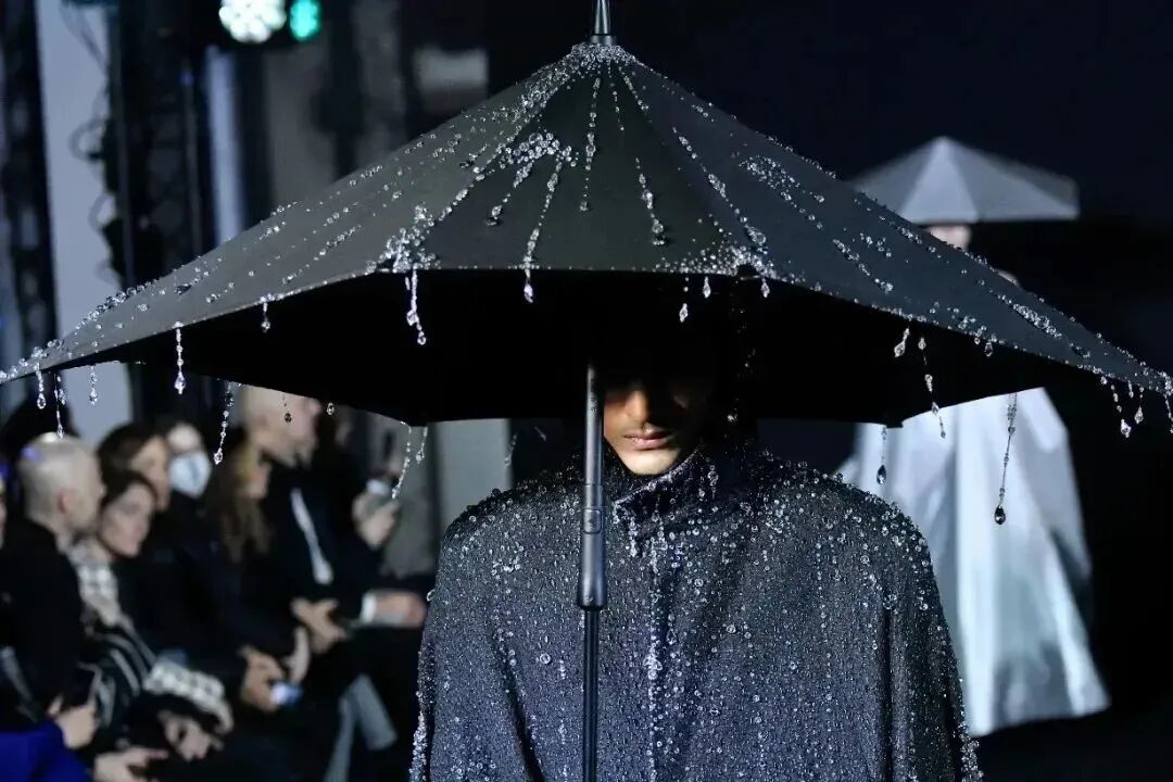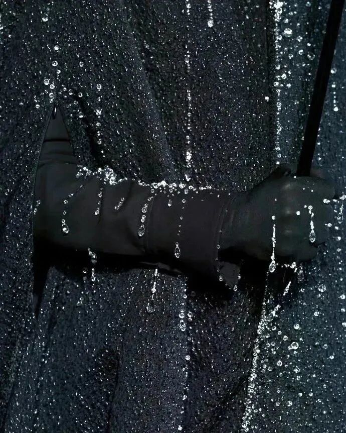 一人一傘,通體漆黑,雨滴將落未落,模特的臉隱藏在傘影之下,極具神秘色彩。