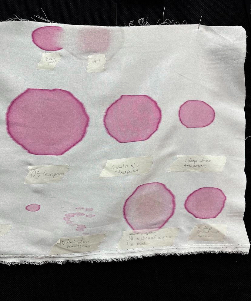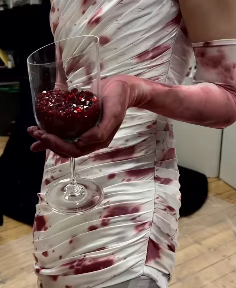 (拉近看細節,發現杯子裡的酒也由紅水晶製成,酒漬的中心和邊緣都點綴著水晶,模擬乾結的血痂▽)