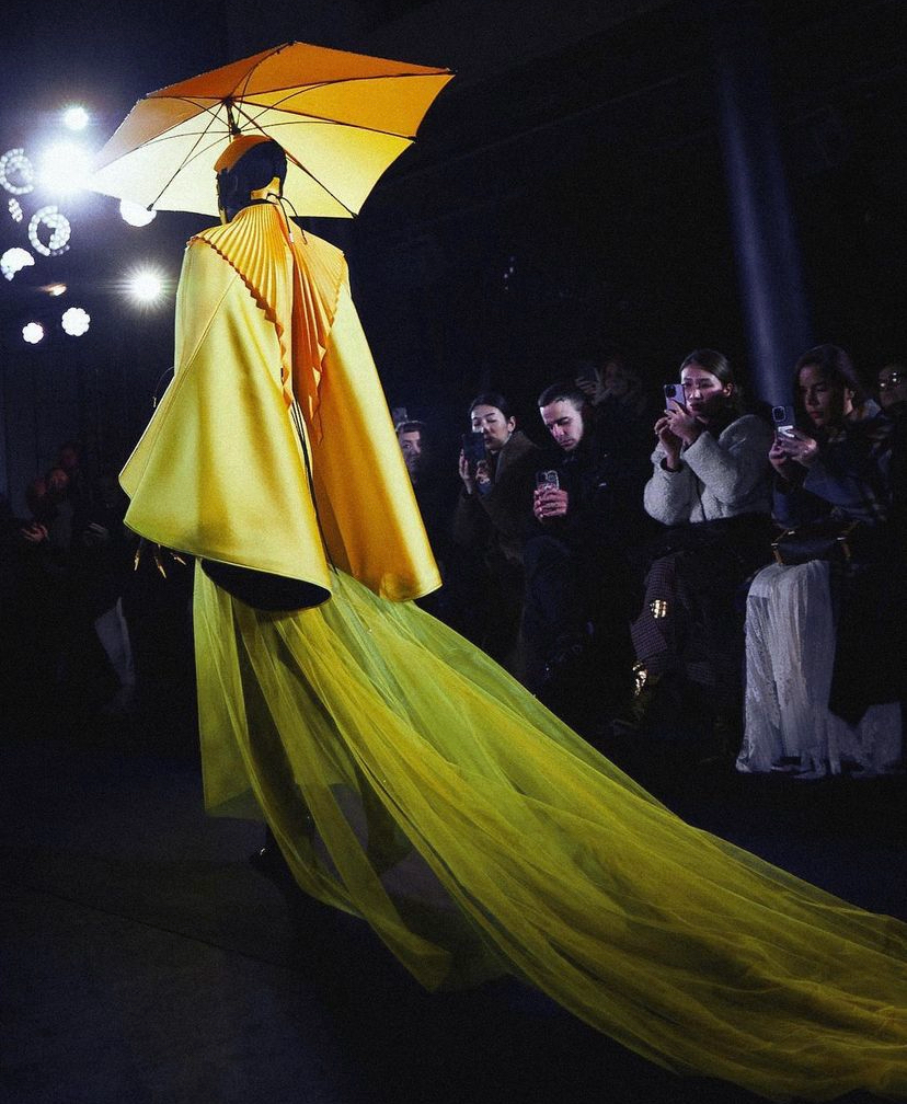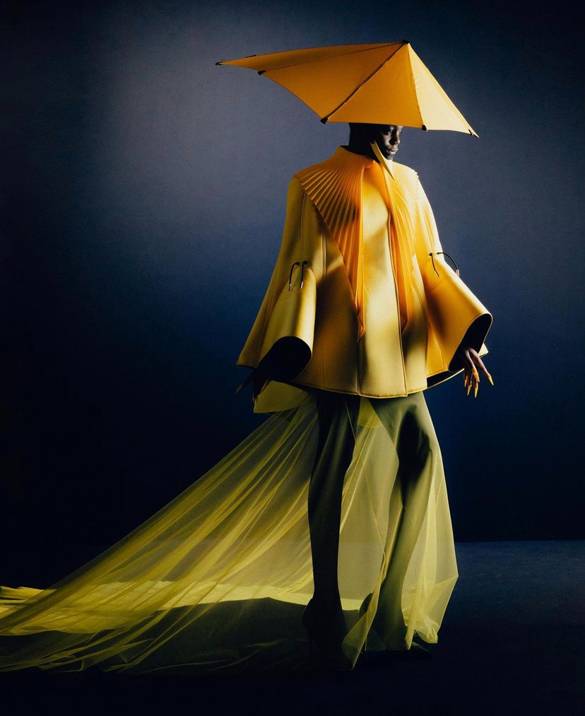 我們可以再看一下這場大秀裡和雨滴裝隸屬同款的另一套設計,明黃色的斗篷+以傘為帽▽