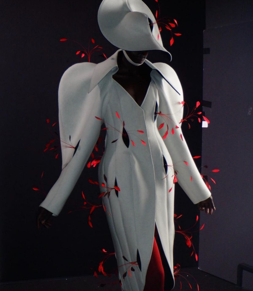 帶有雕刻袖子的雙面羊毛外套,被人為剪裁出了很多空洞,紅色的羽毛從洞口中探出,這是在模擬鮮血飛濺。